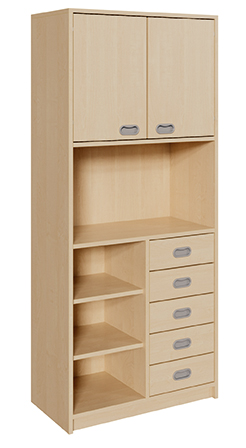 Dieser Korpusschrank in Dekor Buche hell hat oben 2 Türen 60 cm hoch, darunter 1 offenes Regalfach, darunter 5 Schübe mit Dekorblenden (gesichert gegen unbeabsichtigten Komplettauszug) und daneben 3 offene Regalfächer. Er besitzt eine 8 mm starke Sichtrückwand und einen Korpus von 19 mm.