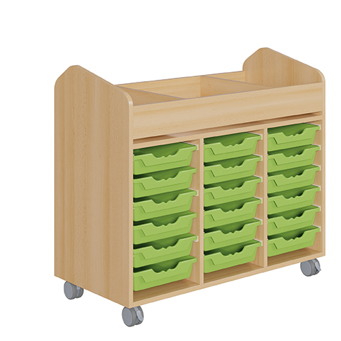 Er hat oben 3 Fächer, unten 18 flache ErgoTray Boxen und hinten 2 breite Fächer für Flaschen oder Becher, mit Aufkantung 6 cm.