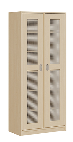 Dieser Bettzeugschrank mit 2 Lochblechtüren in Dekor Buche hell und 12 Fächern (je 2 nebeneinander) besitzt eine 8 mm starke Sichtrückwand und einen Korpus von 19 mm.