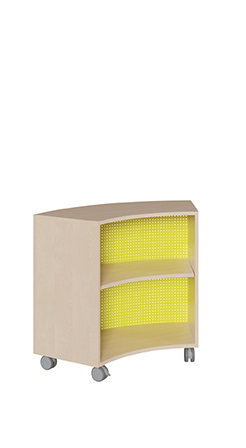 Sechstelkreisschrank auf Rollen in Dekor Buche hell mit 4 Fächern und Mittelwand hat einen Korpus von 19 mm und 1 festen Einlegeboden.