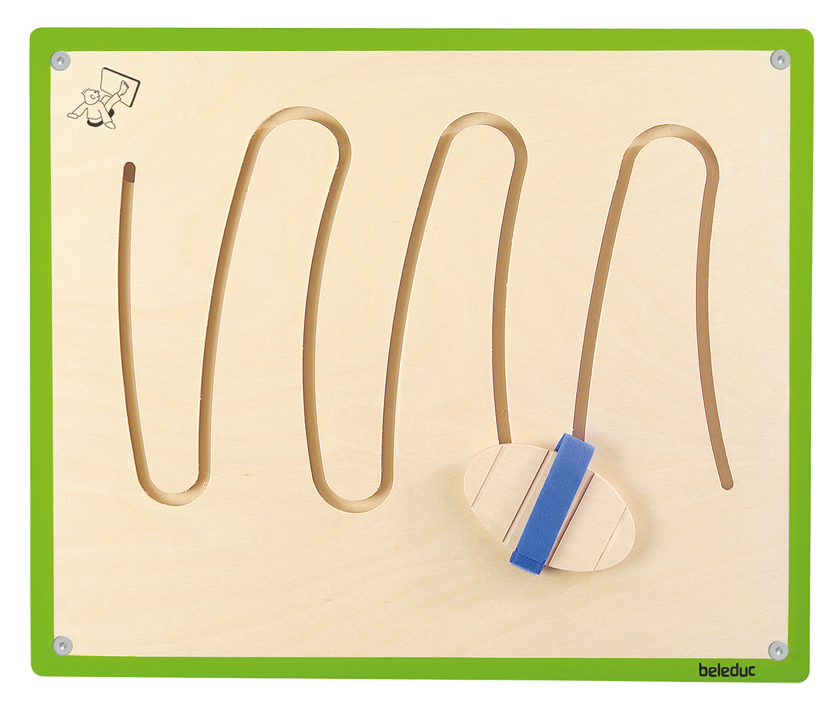 Bei diesem Wandspiel sind die Bahnen eingefräst. Die Kinder sollen ihren Fuß oder die Hand in die dafür vorgesehenen Schlaufen des Schiebeelements stecken und mit diesem dann den Bahnen folgen. Dabei soll die Bewegung möglichst fließend erfolgen.