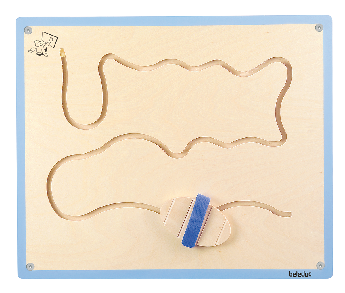 Bei diesem Wandspiel sind die Bahnen eingefräst. Die Kinder sollen ihren Fuß oder die Hand in die dafür vorgesehenen Schlaufen des Schiebeelements stecken und mit diesem dann den Bahnen folgen. Dabei soll die Bewegung möglichst fließend erfolgen.