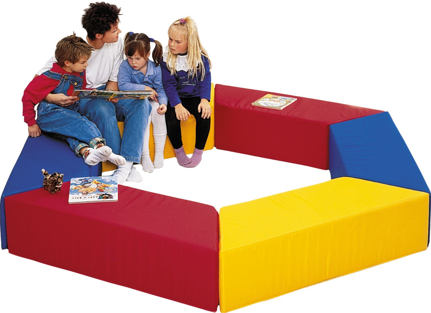 6 Trapezsteine aus stabilen Schaumstoff ergeben eine Runde Sitzecke. Die Teile können aber auch ganz individuell zusammen gestellt werden, dann entstehen kleine Sitzinseln. An den Außenseiten ist Klettband angebracht, so dass die Teile aneinander haften.
