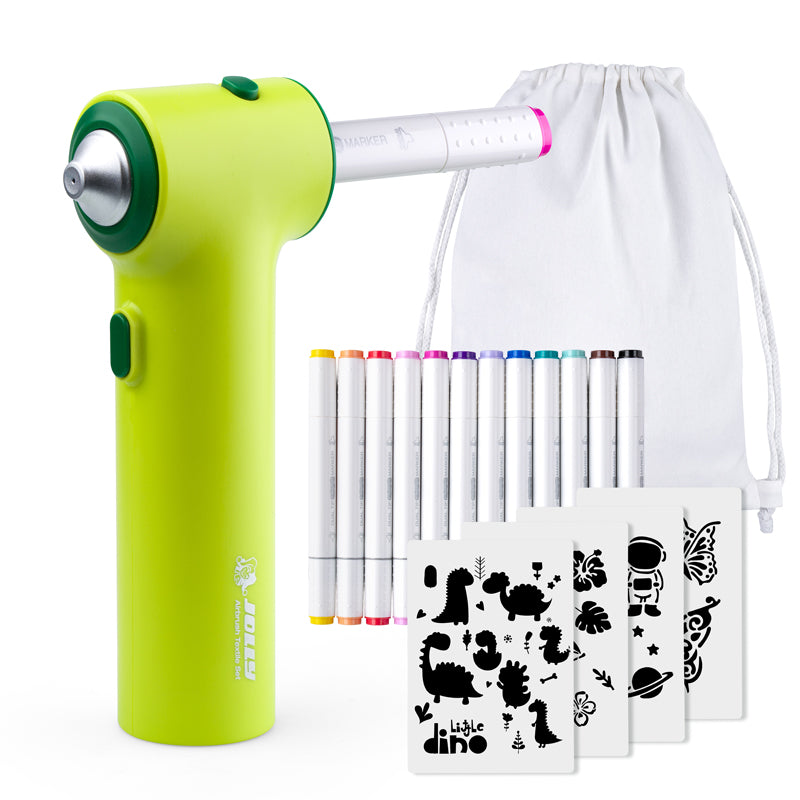 Included in the set: 1 x electric airbrush, 12 fabric markers, 4 stencils, 1 sports bag, 1 USB charging cable (without power adapter)