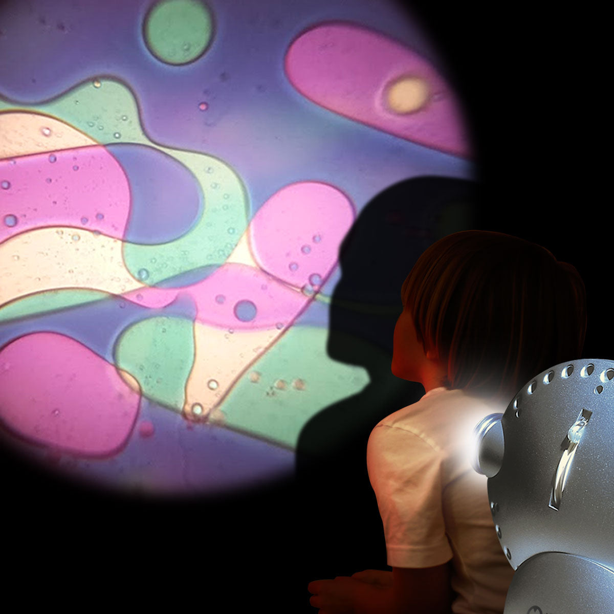 Simply slide the violet-green effect lens sideways into the projector and focus the image.