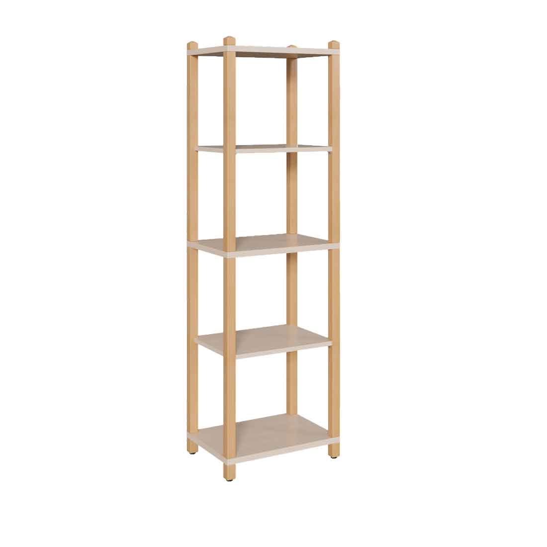 Storage rack with upright construction, featuring 3 fixed shelves and 2 adjustable shelves