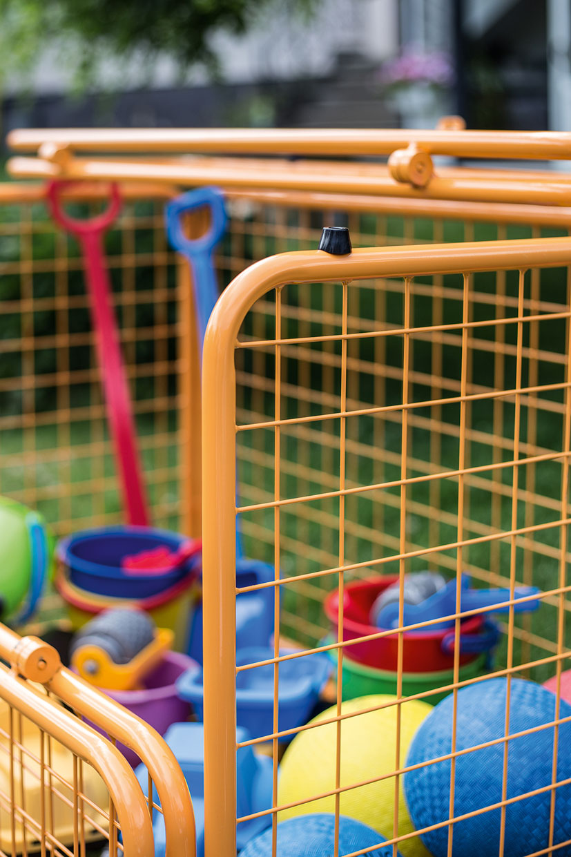 The sand can simply trickle out, and the children can easily access the toys through the fold-down front. In winter, the cart can also be used indoors for equipment from the sports room.