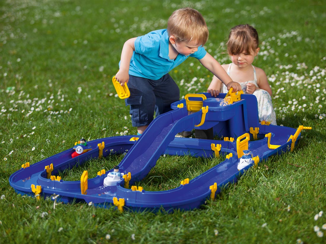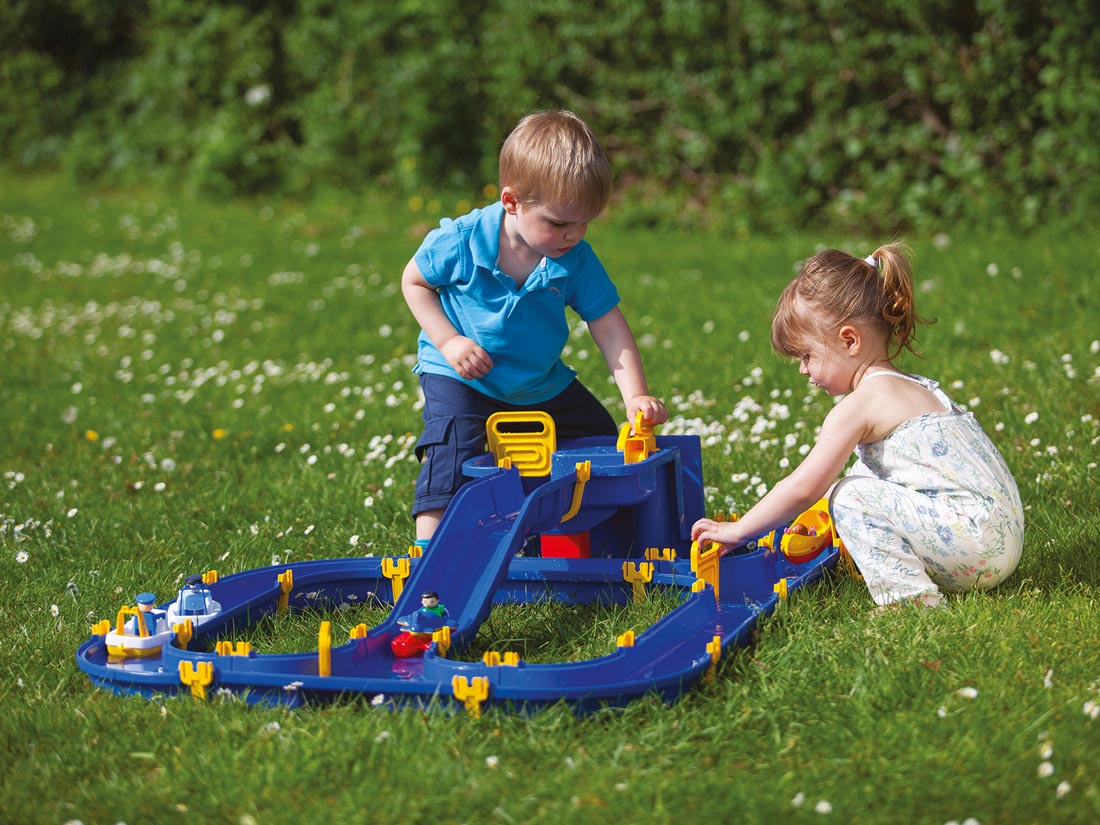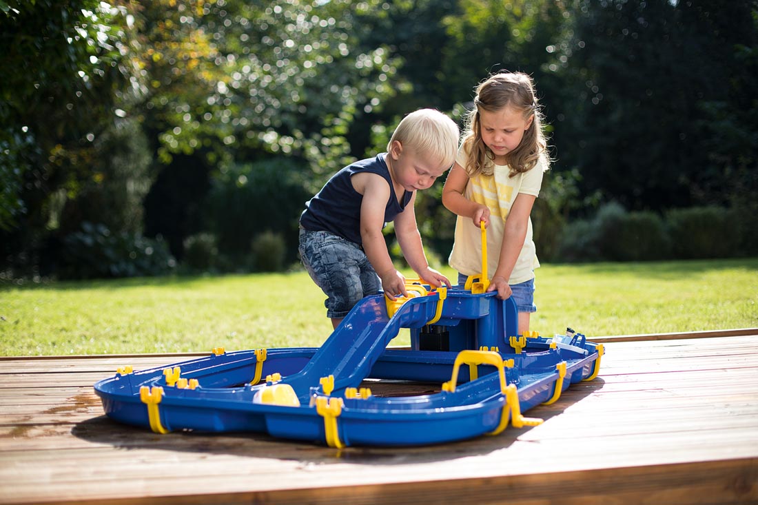Le jeu aquatique Niagara de BIG-Waterplay a été testé par la LGA conformément aux normes de sécurité des jouets les plus strictes. Il est facilement extensible grâce à une gamme complète d'accessoires. Des instructions de montage claires et concises sont incluses dans chaque emballage. Régulation de l'eau – Les deux vannes permettent de fermer l'aire de jeux aquatiques. Un courant peut être créé à l'aide de la manivelle, permettant ainsi aux enfants de diriger les bateaux.