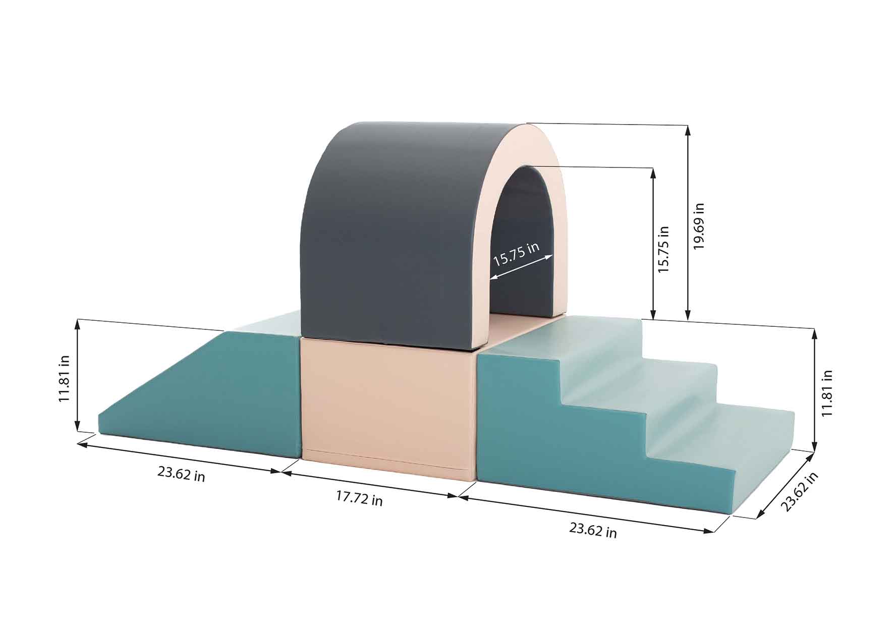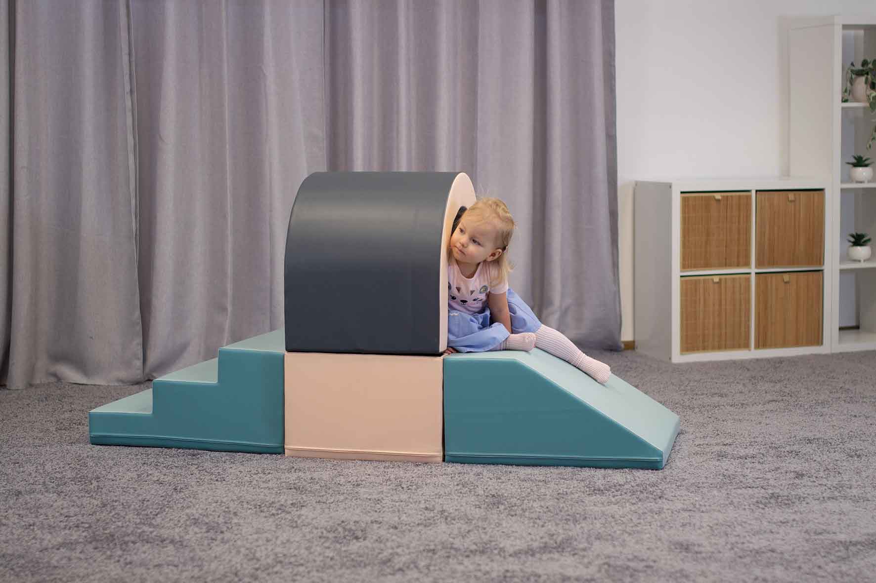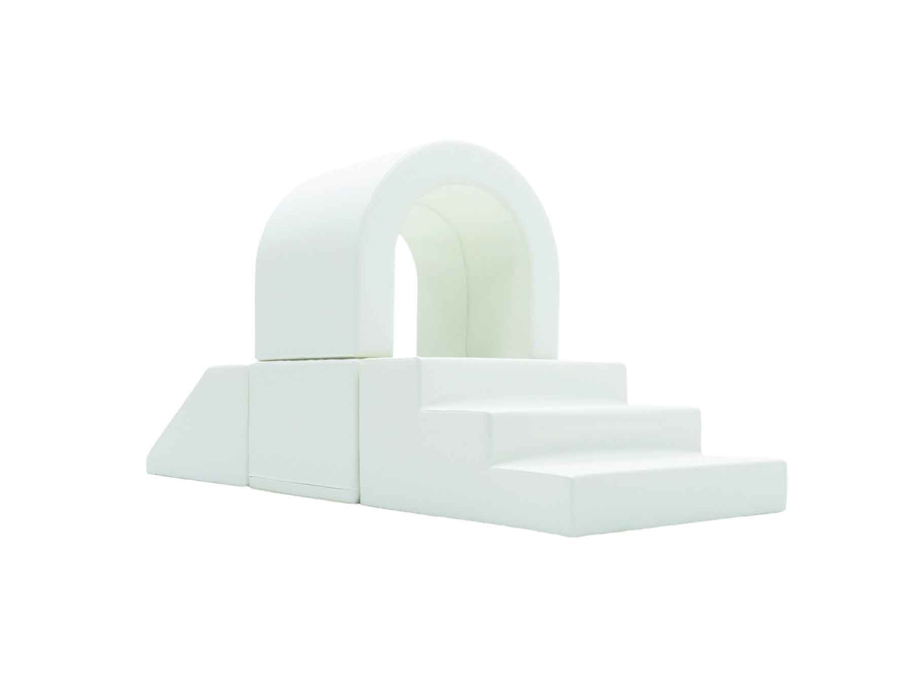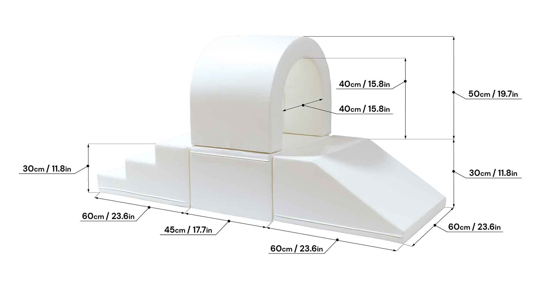 Cuboïde 60 x 45 x 30 cm Rampe 60 x 60 x 30 cm Marche 60 x 60 x 30 cm Tunnel 45 x 60 x 50 cm (Passage 40 x 40 cm) Disponible en couleurs vives, pastels ou blanc. Il invite votre enfant à