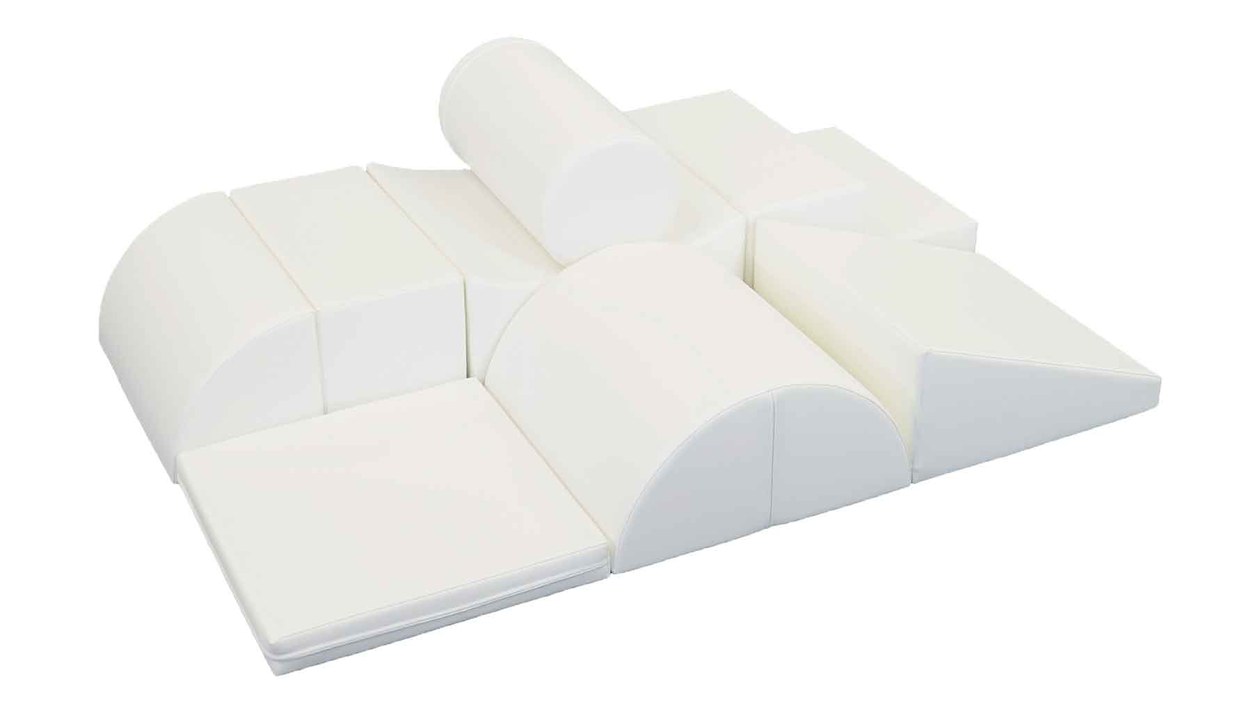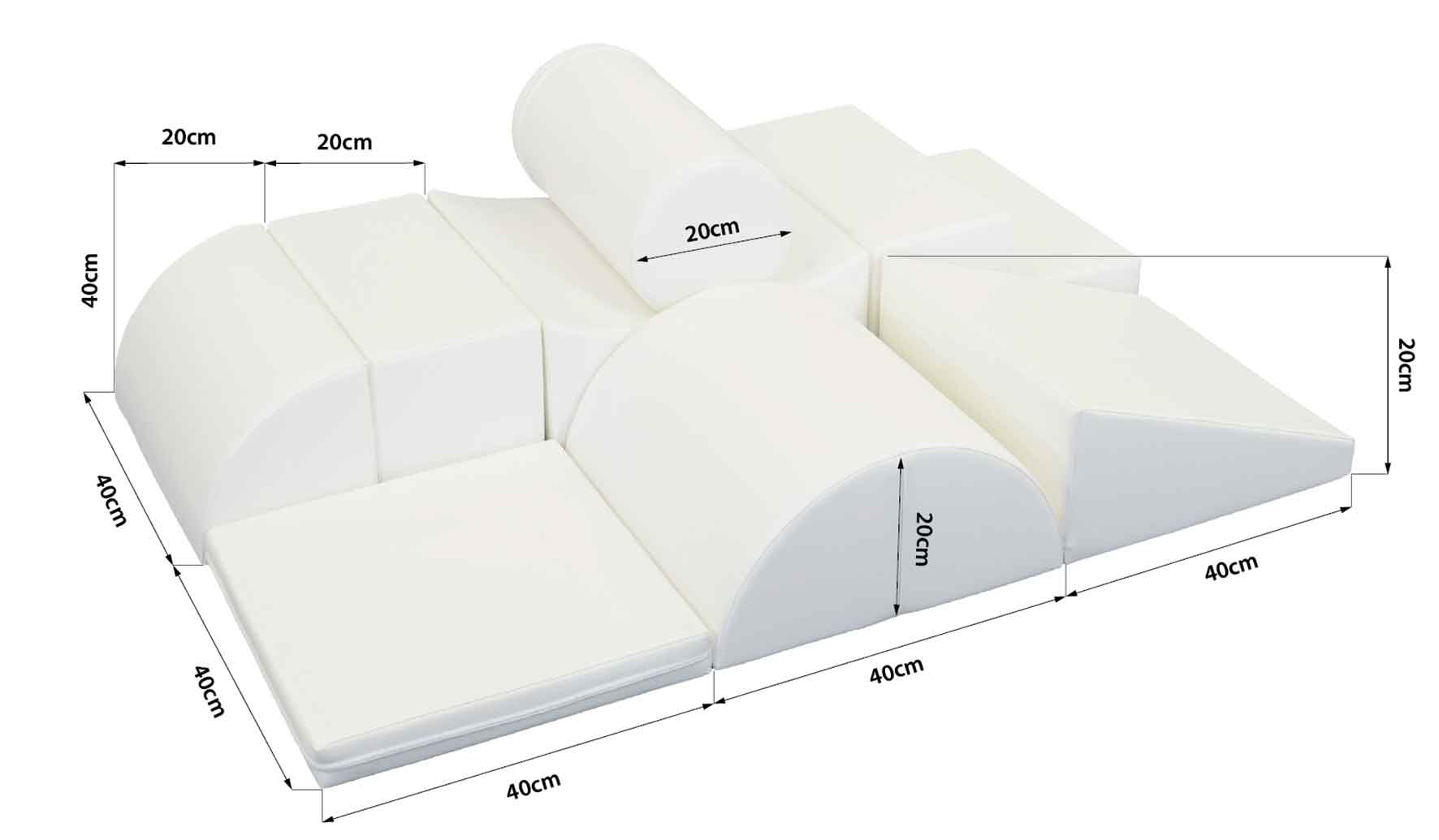 Ce jeu de construction souple en 8 pièces comprend : Quart de cercle 40 x 20 x 20 cm Cuboïde 40 x 20 x 20 cm Plateau 40 x 40 x 20 cm Marche 40 x 40 x 20 cm Demi-circulaire 40 x 40 x 20 cm Rampe 40 x 40 x 20 cm Rouleau 40 Ø 20 cm Tapis 40 x 40 x 5 cm Disponible en couleur ou en blanc. Conçu pour les aventuriers.