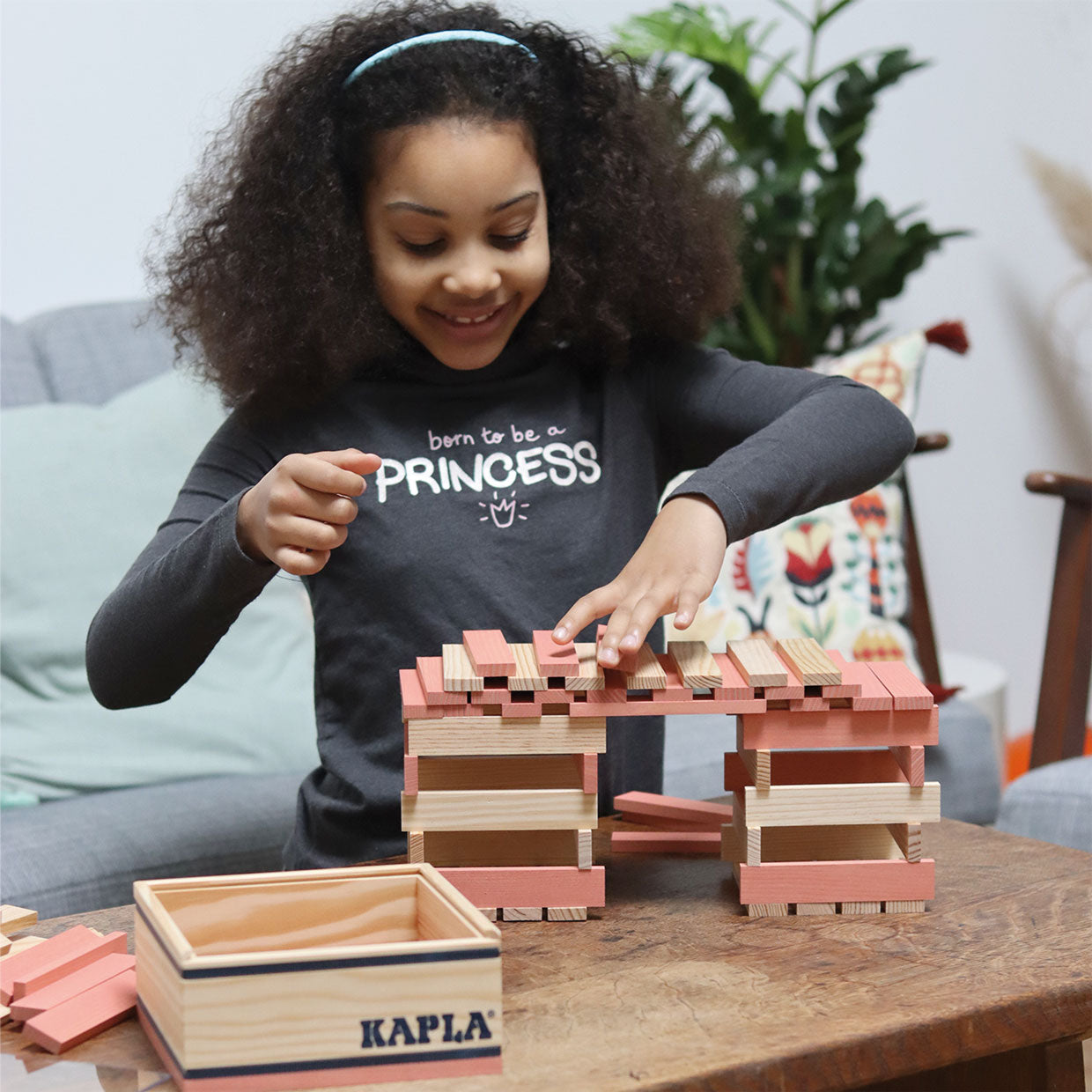Les blocs de construction KAPLA® sont toujours de la même taille. Ce sont des jouets en bois créatifs et éducatifs qui favorisent la pensée spatiale, la motricité et la créativité.