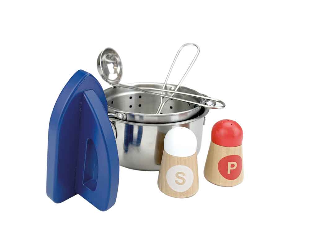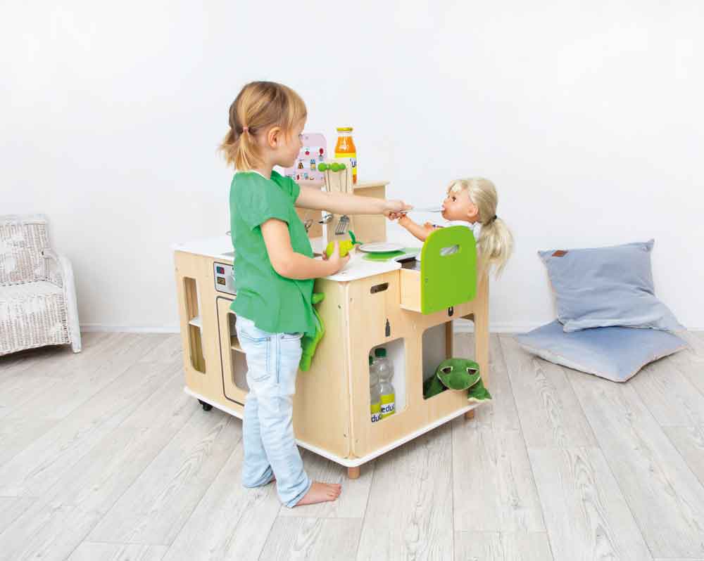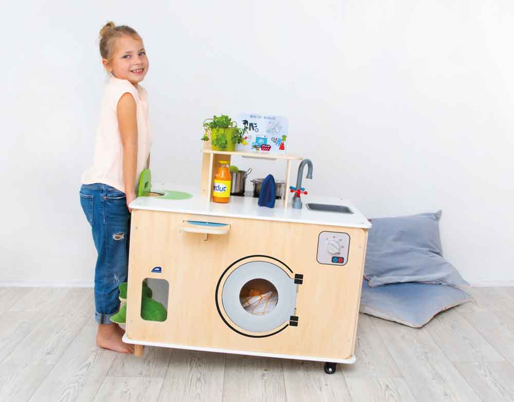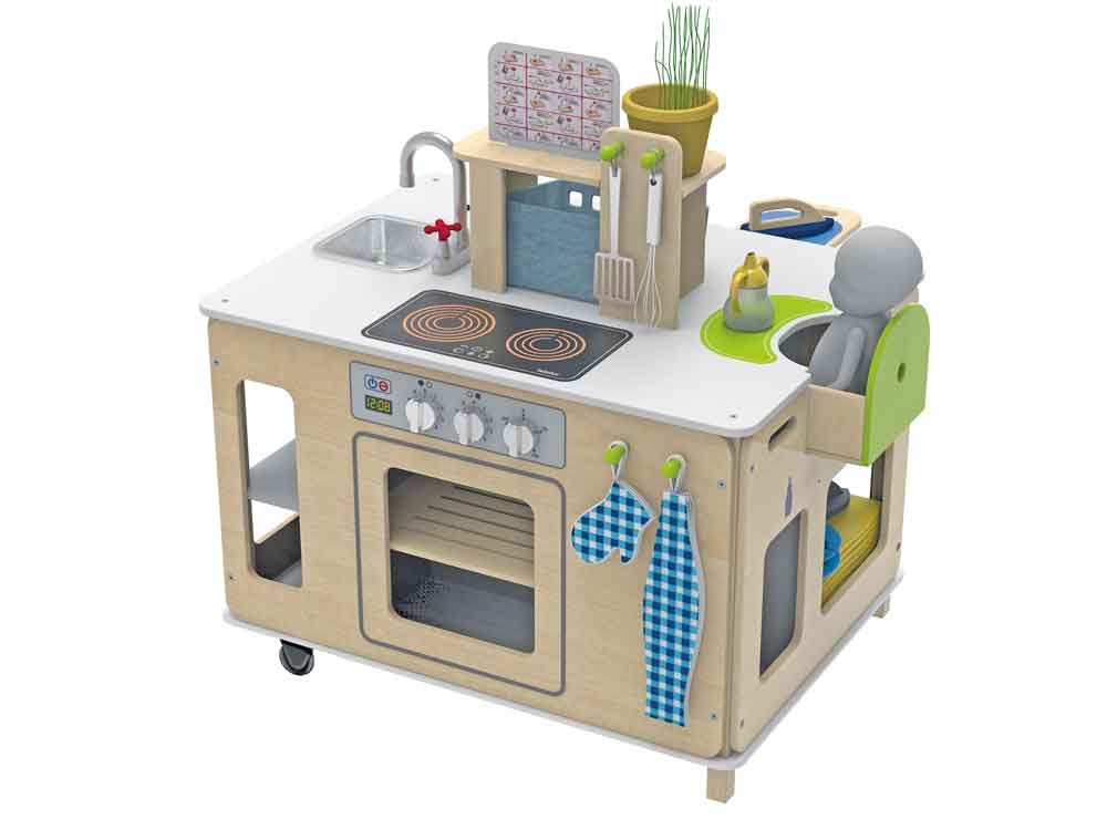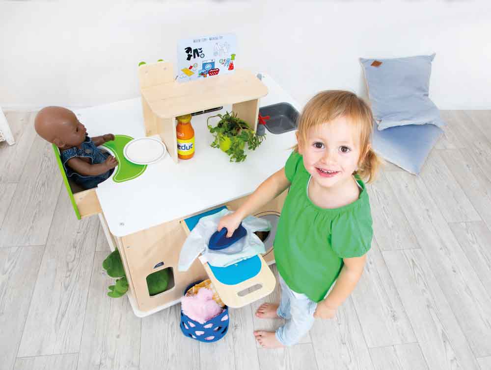 Il y a quelque chose à découvrir de chaque côté : une kitchenette avec plaques de cuisson, four et de superbes fiches de recettes, une chaise haute escamotable et tout le nécessaire pour s’occuper de la poupée, un coin repassage et lessive avec un fer et une planche à repasser escamotable, ainsi qu’un évier et une poubelle pour garder les choses bien rangées.