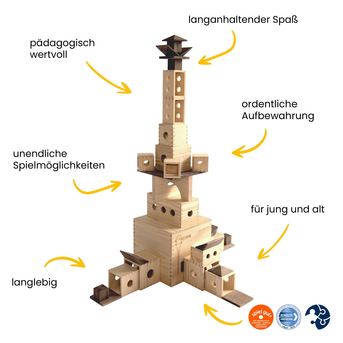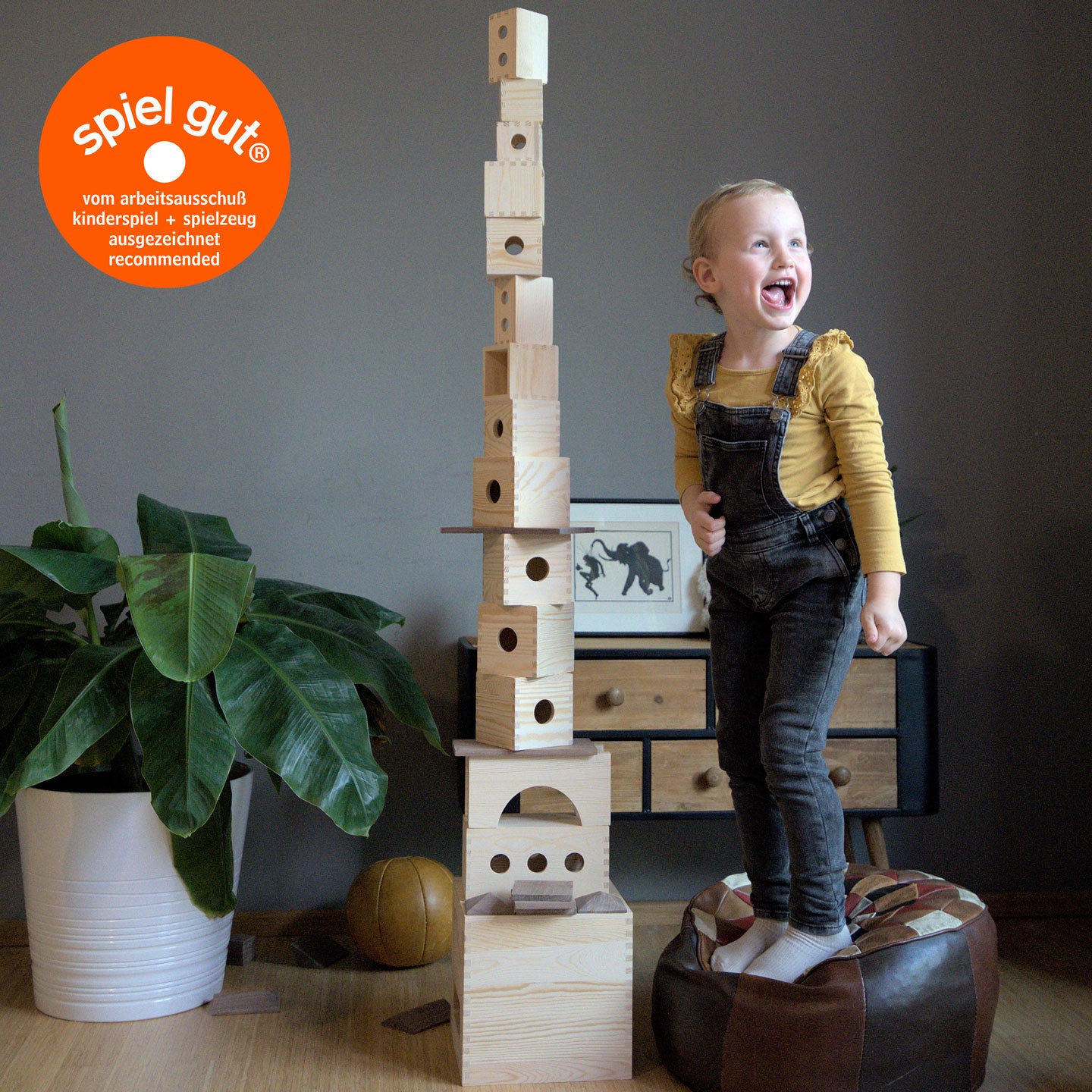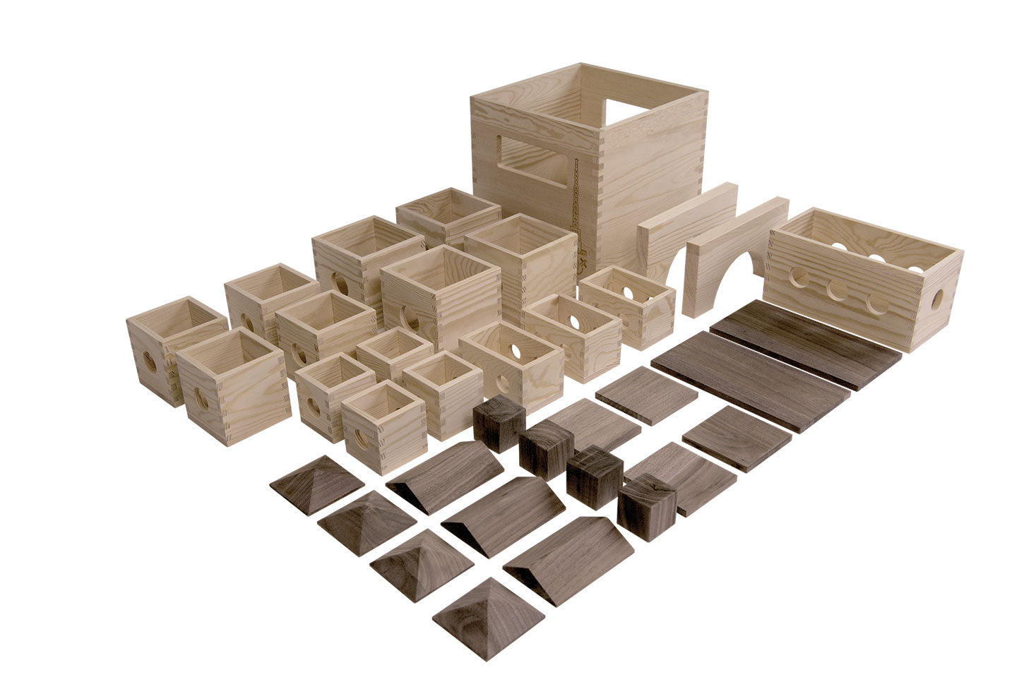 Mais l'aspect éducatif n'est pas le seul atout. Les robustes boîtes en pin et les blocs de construction de haute qualité en noyer sont gages de durabilité et de respect de l'environnement. Sans danger pour les enfants de tous âges, ils garantissent des heures d'amusement.