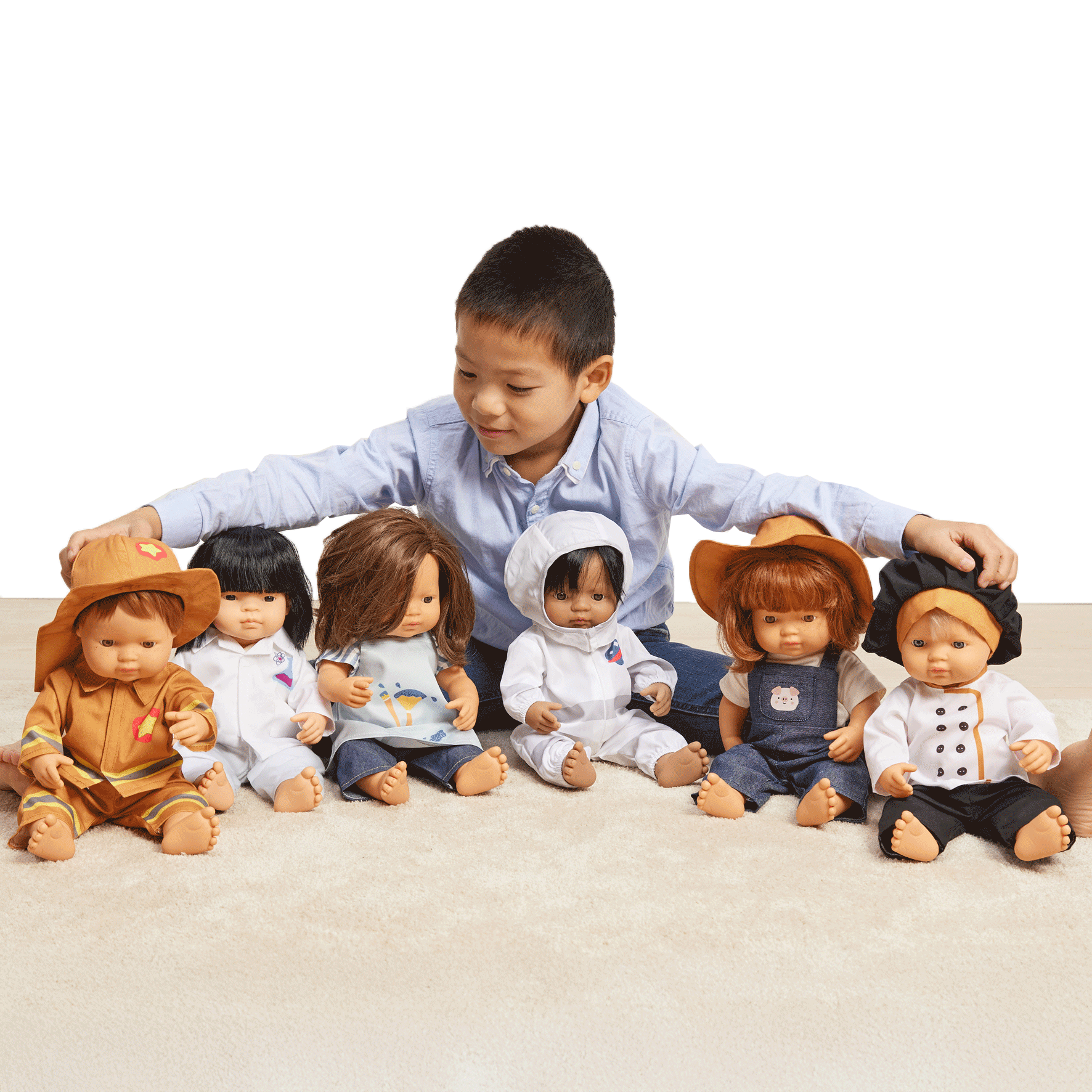 Ce costume de fermier, conçu avec amour, transforme n'importe quelle poupée en petite fermière. L'ensemble convient aux poupées d'environ 38 cm et comprend un haut pratique et un pantalon résistant – idéal pour des aventures passionnantes à la ferme de la poupée.