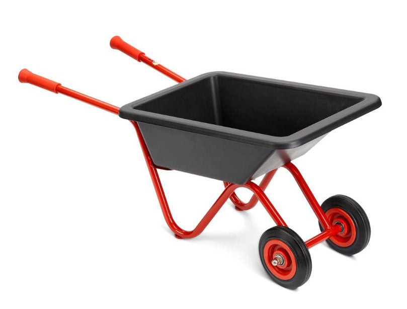 Brouette ROSE pour enfants avec un cadre métallique robuste, une cuve en plastique de haute qualité et des roues de qualité à profil en caoutchouc assurant un roulement fluide.