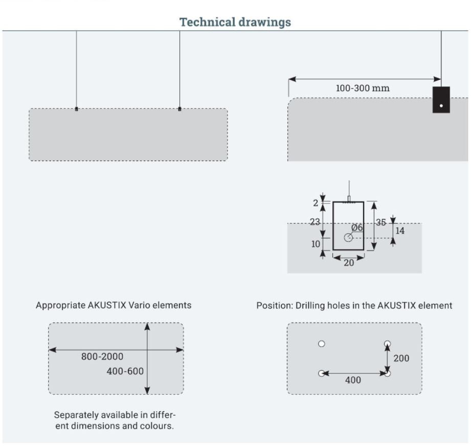 Ce système de suspension est nécessaire pour fixer les panneaux d'insonorisation au plafond, c'est-à-dire pour une pose verticale. Il convient aux panneaux d'une épaisseur maximale de 2,5 cm. Deux fixations sont fournies par panneau.