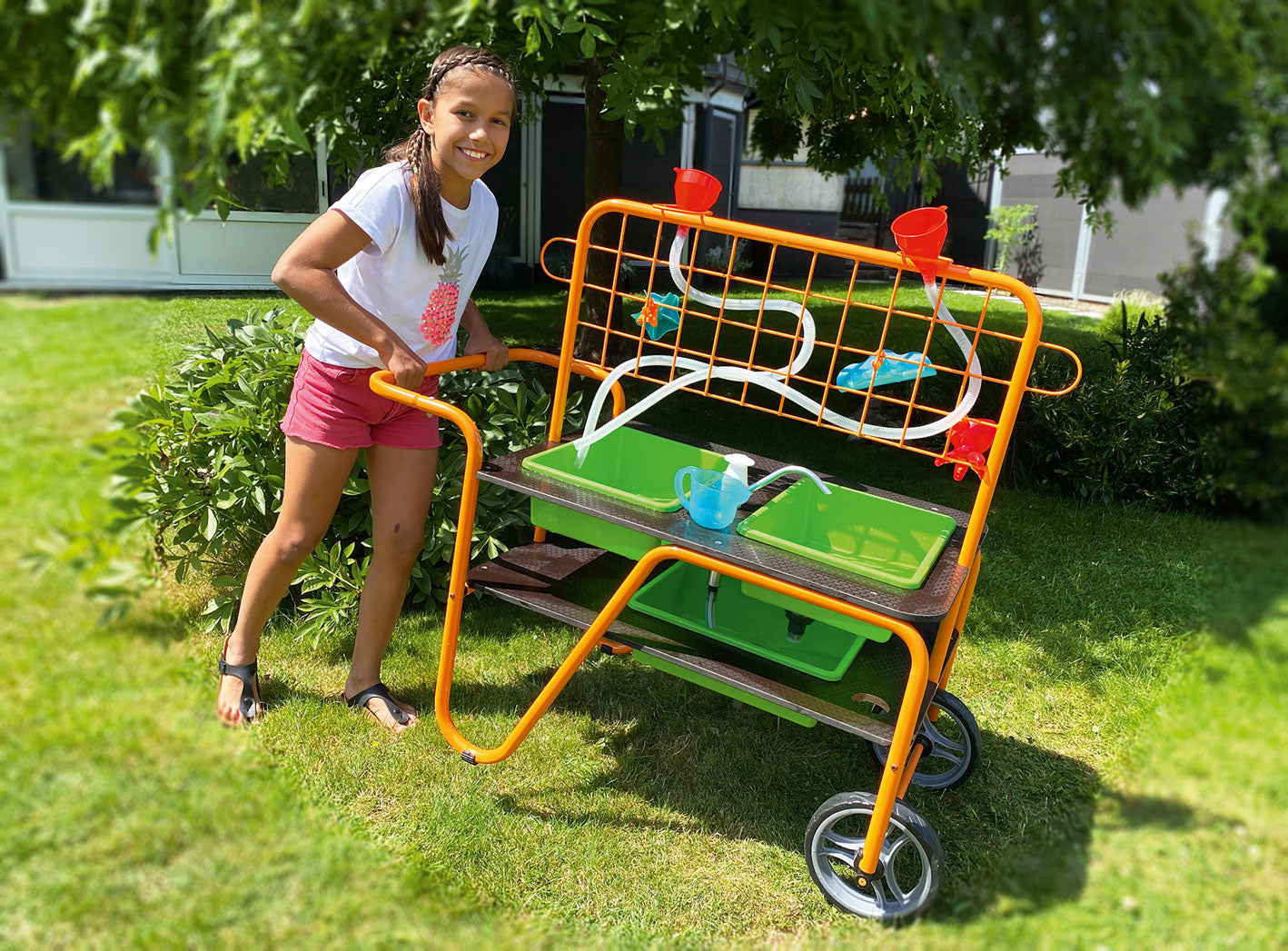 Il peut également être facilement déplacé. Cela signifie qu'il peut être installé à l'extérieur lorsque le temps le permet ou à l'intérieur. Deux bacs sont placés à une hauteur de travail de 55 cm, chacun muni d'un bouchon de vidange . L'eau du troisième bac, situé plus bas, peut être pompée à l'aide de la pompe manuelle fournie. Ceci permet aux enfants de créer un circuit d'eau.