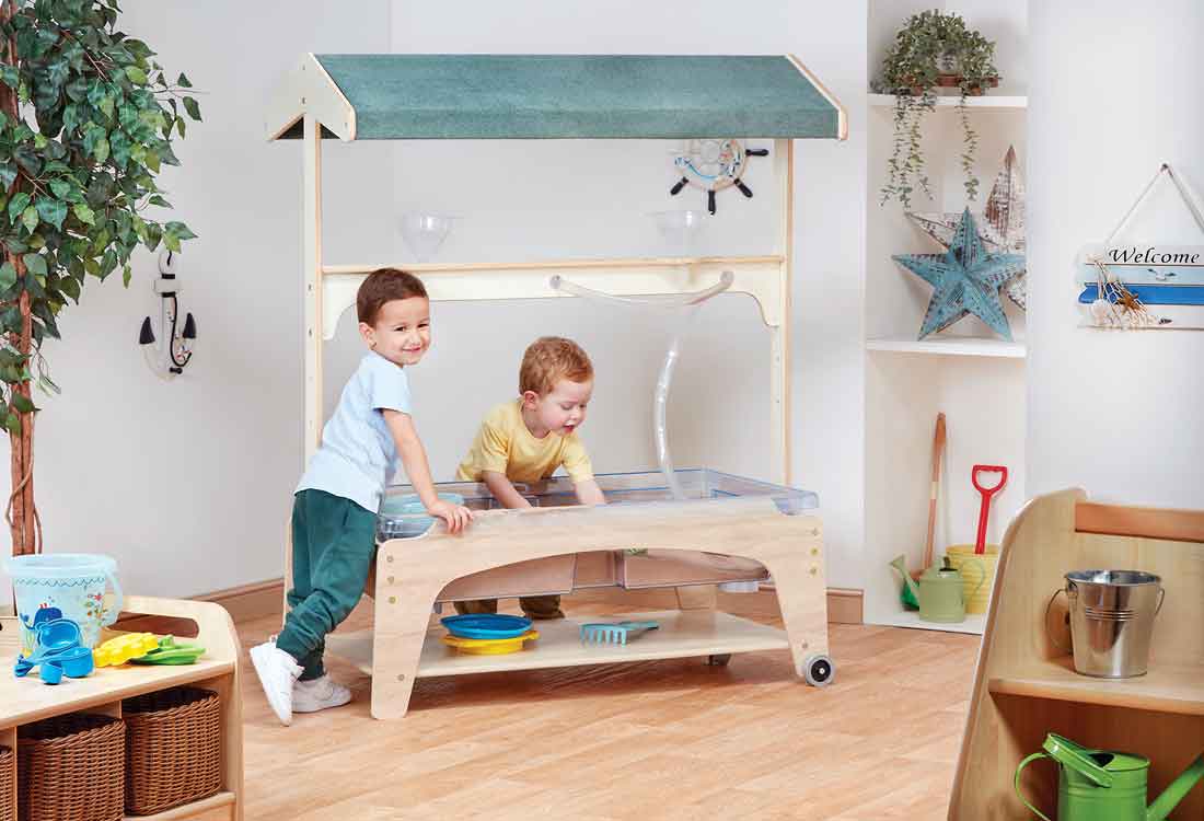 Das Regal passt auf die Mini-Sand-Wassertische mit den Maßen 110 x 62 cm. Es wird seitlich angeschraubt. Der Baldachin besteht aus waschbaren, abwischbaren Stoff.