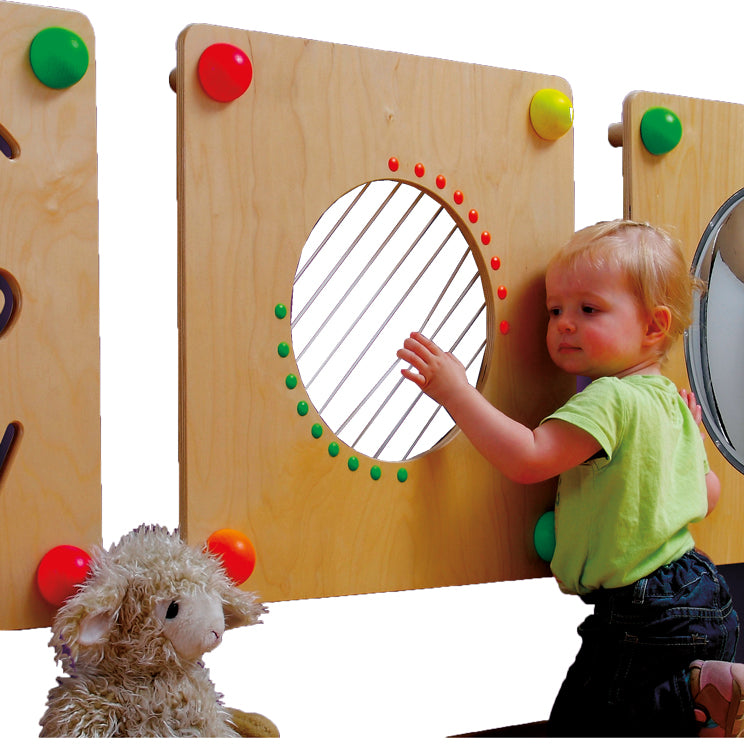 Das Babypfad-Element „Gitarre“ bringt Klang und Bewegung zusammen und lädt Kinder zum aktiven Entdecken ein. Die unterschiedlich langen Perlon-Saiten erzeugen verschiedene Töne – beim Zupfen mit den Fingern oder beim Darüberstreichen mit der Handfläche entsteht ein spielerisches Klang- und Tasterlebnis. So werden gleichzeitig Hörsinn und Tastsinn gefördert und die natürliche Neugier kleiner Musiker geweckt. Wie alle Babypfad-Elemente ist „Gitarre“ vielseitig einsetzbar – als Wandspiel, als Bodenelement mit den passenden Babypfad-Aufstellscheiben oder als Teil einer geschlossenen Babybox aus vier Elementen.