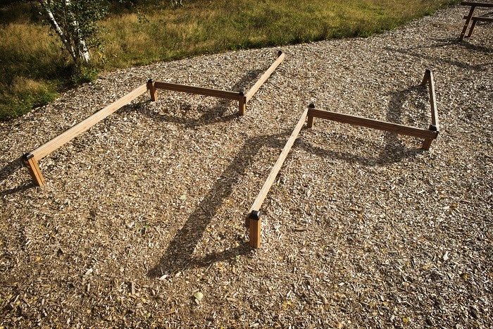Auf diesen beiden Balancierbalken aus Lärchenholz können die Kinder ihre Geschicklichkeit und den Gleichgewichtssinn stärken.