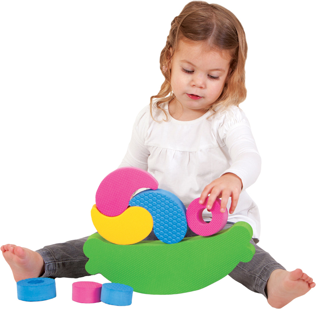21 moosgummiartige Bausteine sollen auf dem Schiffchen übereinander gestapelt werden und nicht kippen.