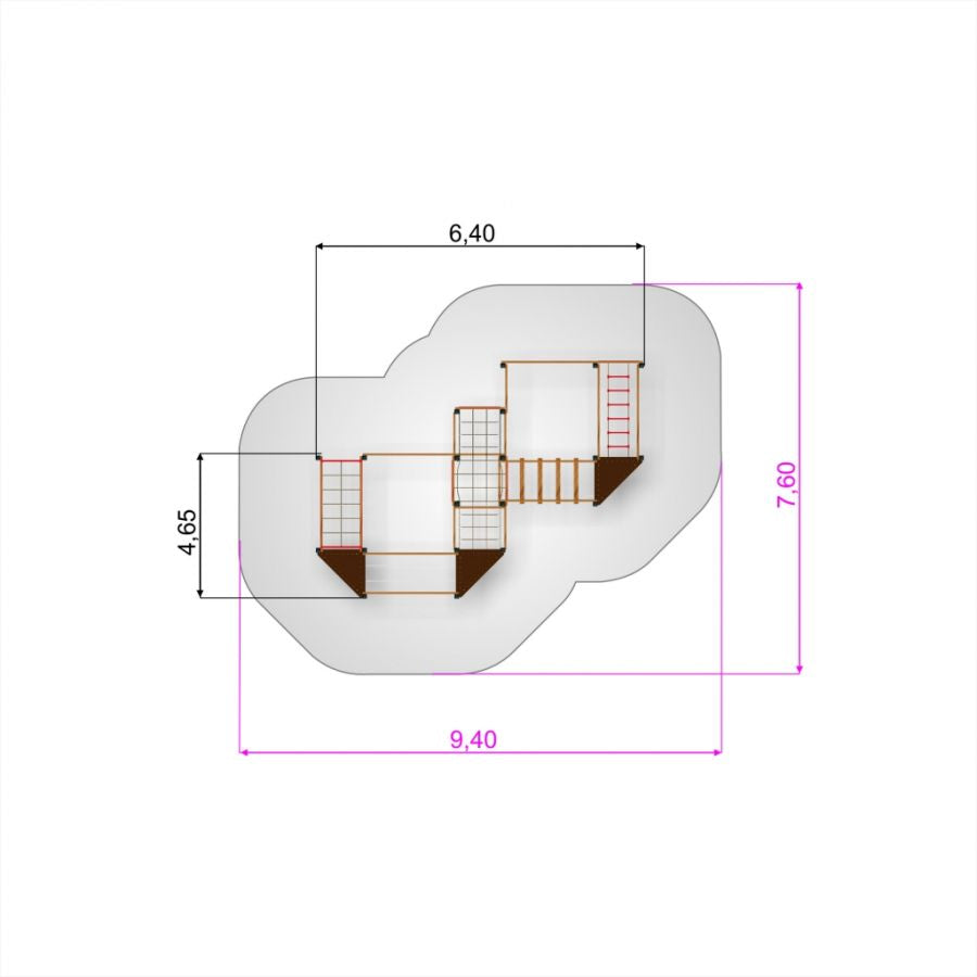 Maße der Anlage: 6,40 x 4,65 m Höhe der Plattform: 38 cm Sicherheitsbereich: 9,40 x 7,60 m max. Fallhöhe: 0,87 m