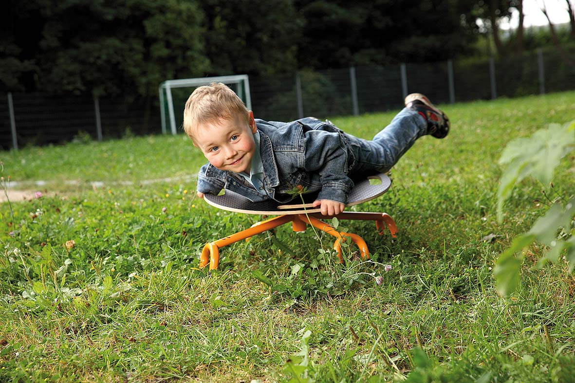Egal ob sitzend oder liegend, die Balancierdrehscheibe ist eine Herausforderung für jedes Kind.