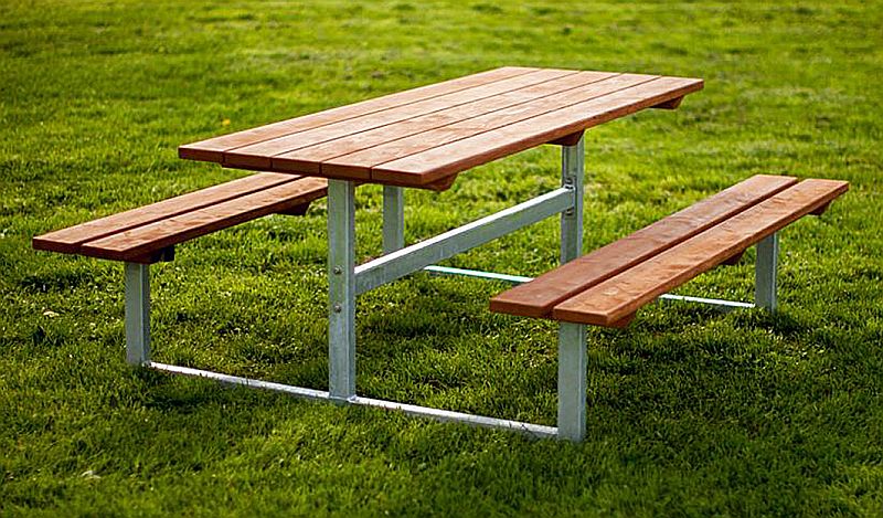 Hochwertige Bank- und Tischkombination aus Lärchenholz mit verzinkter Stahlunterkonstruktion.