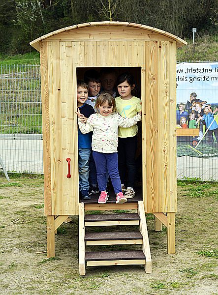 Es ist jedoch möglich mit einfacher, umweltfreundlicher Holzfarbe/-lasur den Bauwagen mit den Kindern zu gestalten. Die Seitenwände und das Dach sind aus ca. 2 cm dicken Lärchenholz-Paneelen. Die Bodenplatte und die Treppenstufen aus extrem robusten Außenspielgeräte-Podestplatten, extra aufgeraut, um auch bei feuchtem Wetter sicheren Stand zu garantieren.
