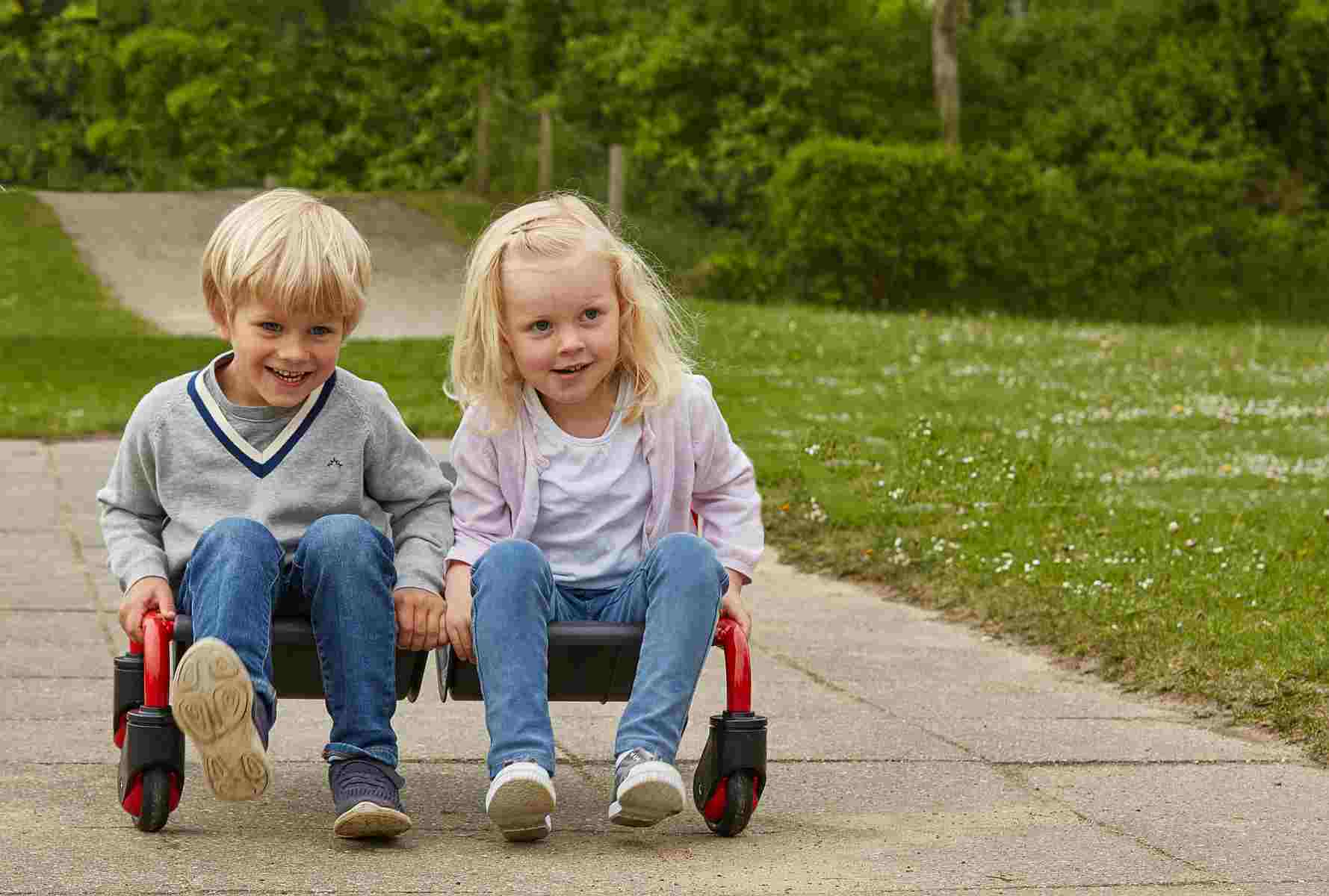 Der lustige Sofa Surfer ist ein ganz besonderes Fahrzeug, das die Koordinationsfähigkeit der Kinder herausfordert. Kinder koordinieren ihre Bewegungen, sie kommunizieren und kooperieren, weil sich jedes Rad um 360 Grad drehen kann und somit die Richtung nur gemeinsam bestimmt werden kann. Der Sofa Surfer fördert soziale Interaktion und bietet spannende Spielideen, in denen kleine Kinder ihre Fähigkeiten entwickeln. Platznehmen und losfahren ist einfach und leicht, da ohne Pedale gestartet und gefahren wird. Das macht dieses Fahrzeug ideal für kleine Kinder, die noch nie mit einem Dreirad oder Fahrrad gefahren sind. Bequeme Sitze und ein einzigartiges Design, das robust und gleichzeitig sicher ist. Hergestellt aus kindersicheren Materialien mit ungiftigen Oberflächen und in bekannter WINTHER Qualität.