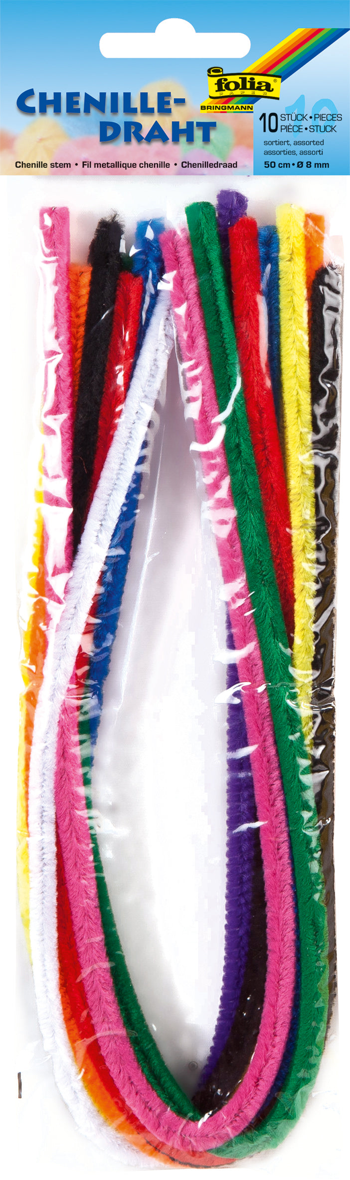 Die Packung beinhaltet 10 Drähte in verschiedenen Farben. Jeder einzelne Draht ist 50 cm lang und hat einen Durchmesser von 8 mm.