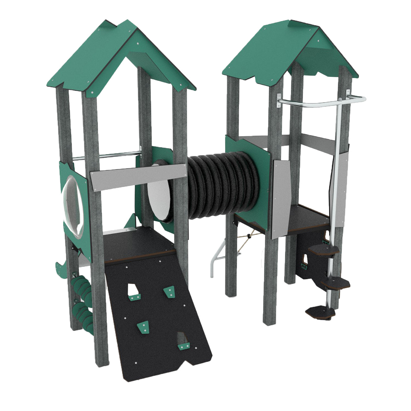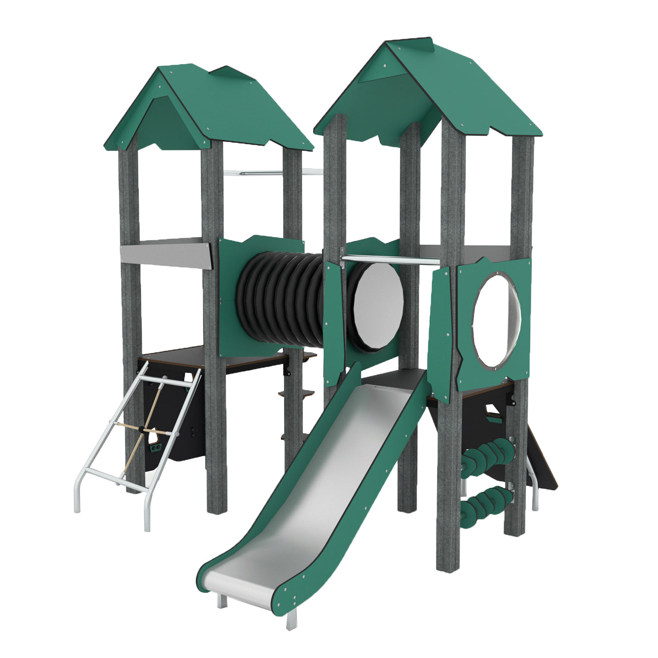 Die kompakte Anlage bietet die verschiedensten Auf- und Abstiegsvarianten. Beide Türme sind mit einer blickdichten Spielröhre verbunden. Ein Turm hat als Auf-/Abstiegsvariante ein festes Kletternetz eingerahmt im Metallrahmen, senkrechtes Kletterbrett mit Griffmulden oder die spannende schwebende Stufentreppe die das Kind auf das Spielpodest in 90 cm Höhe bringt. Durch die Röhre auf den anderen Turm, wo die Kinder die Möglichkeit haben mit der Rutsche aus rostfreiem Stahl hinunter zu rutschen oder das Schrägbrett mit Griffmulden verwenden. Ein tolle Aussicht bietet das große Guckloch mit Polycarbonat-Fenster. Die Anlage bietet Spaß durch das Verstecken, fördert die körperliche Entwicklung durch klettern, schieben oder krabbeln. Die Sinnesorgane werden angesprochen. Ein Turm bietet auch ebenerdig eine Beschäftigung, was eine Rollstuhlnutzung ermöglicht.