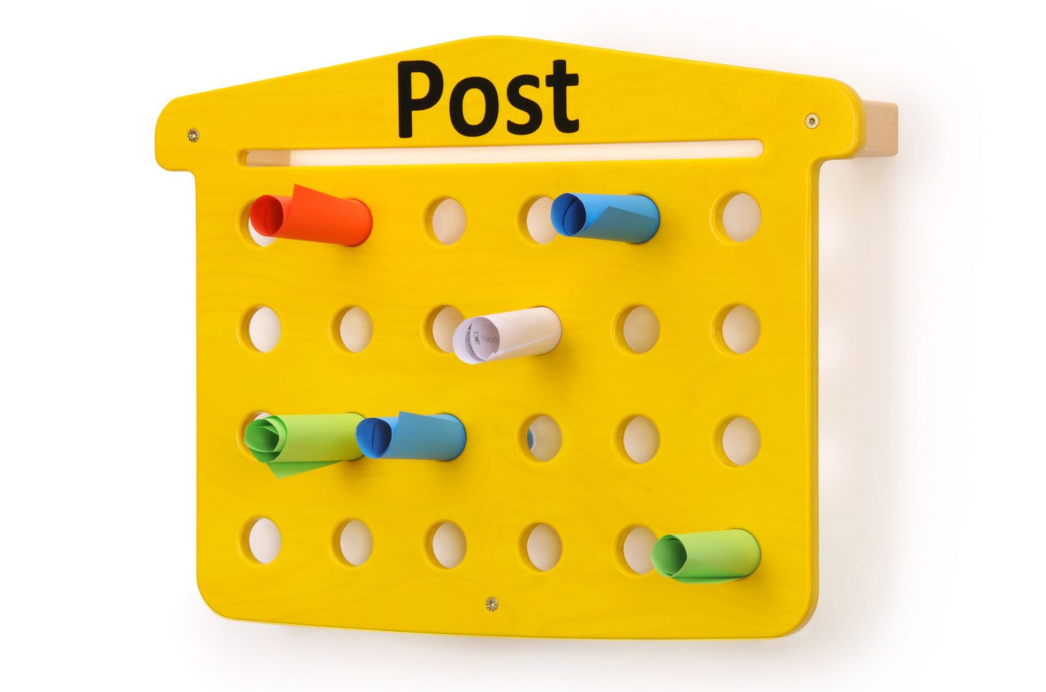 Elternpost-Briefkasten mit 24 Bohrungen für 24 Nachrichten und Informationen für Eltern und Kinder. Dekorativ passt er in jeden Kindergarten.