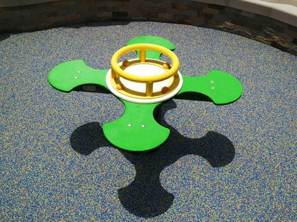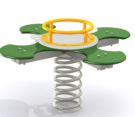 Kinder lieben Federwippen, deshalb sollte auf keinem Spielplatz eine fehlen. Hier in der Form eines Kleeblattes aus Metall.