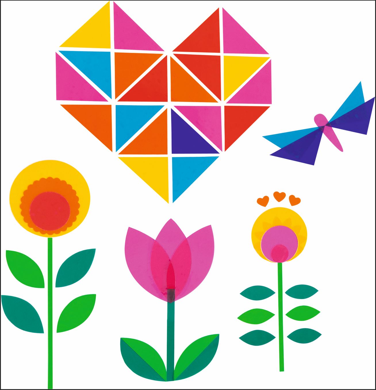Die farbigen Fensterfolien haften auf glatten Oberflächen. Sie können zugeschnitten werden. Die Fensterfolie kann auch übereinander gelegt werden. Dabei verwandeln sich Bilder von gelb und blau zu grün. Die Fensterfolie läßt sich einfach wieder abziehen und neu verwenden.