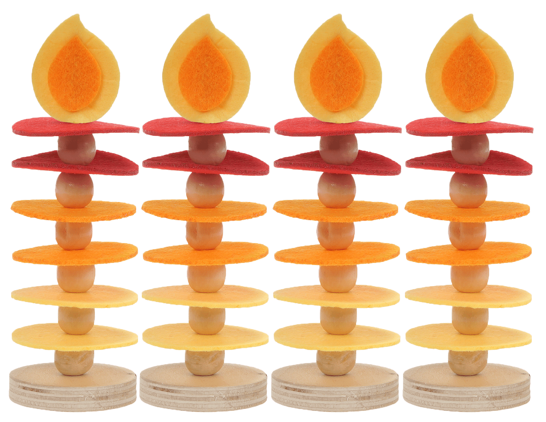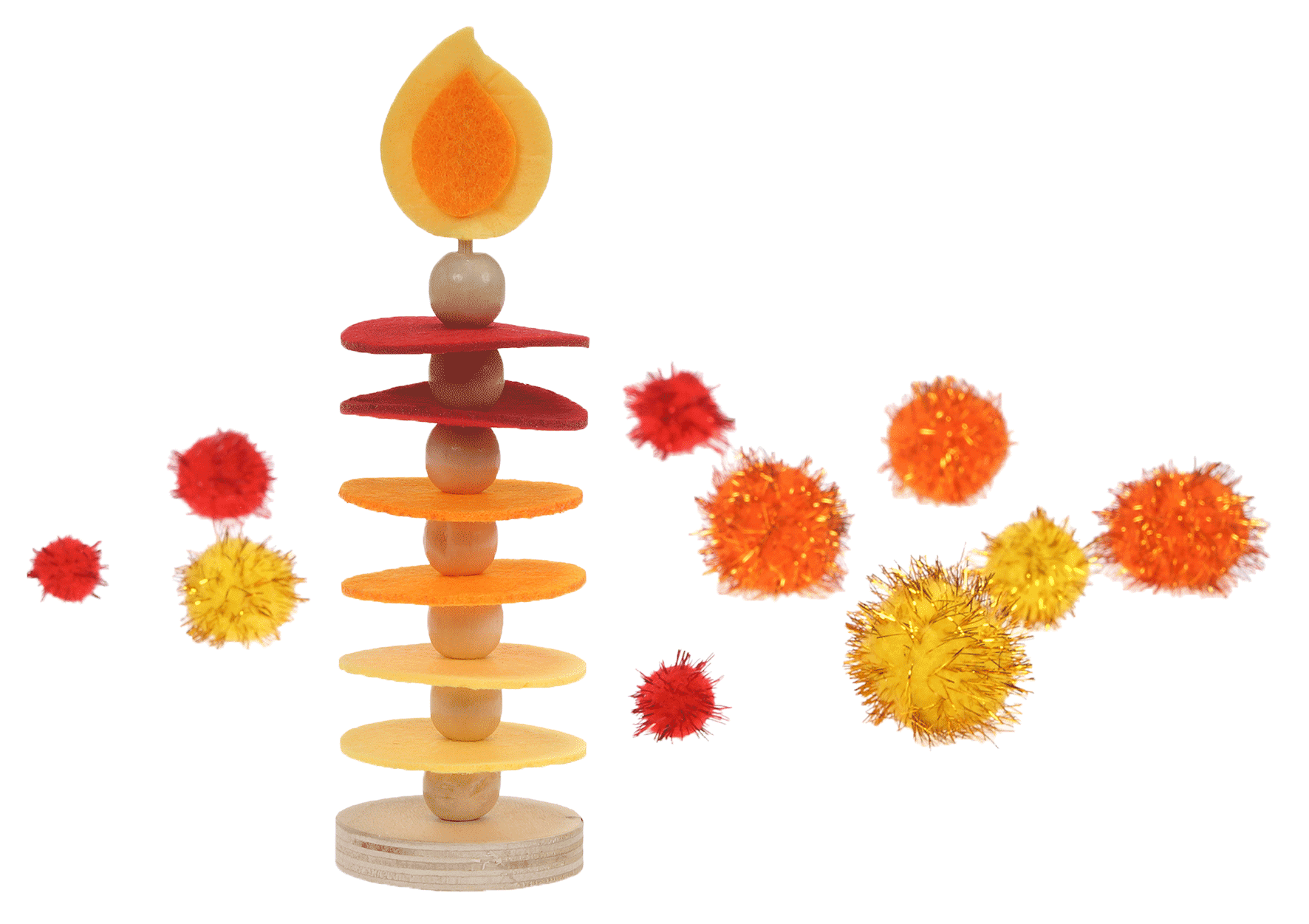 Mit diesem liebevoll zusammengestellten Bastelset können Kinder die Adventszeit kreativ gestalten. Das Beste: Die Kleinen können die Bastelwerke entweder als festliche Dekoration in der Einrichtung nutzen oder als selbstgemachte Weihnachtsgeschenke an ihre Familien verschenken. So vergeht die Zeit bis zum Fest wie im Flug – und die Vorfreude wächst mit jedem gebastelten Teil. Die stilisierten Kerzen mit „leuchtender“ Flamme bestehen aus abwechselnd aufgesteckten Filzscheiben und Holzkugeln. Sie sind eine dekorative und sichere Alternative zu echten Kerzen – ideal z. B. für den Adventskranz in Einrichtungen.