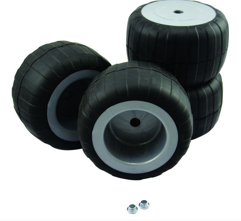 Große schwarze Kunststoffräder mit silbergrauer Felge. Gummierter Belag für leises Fahren.