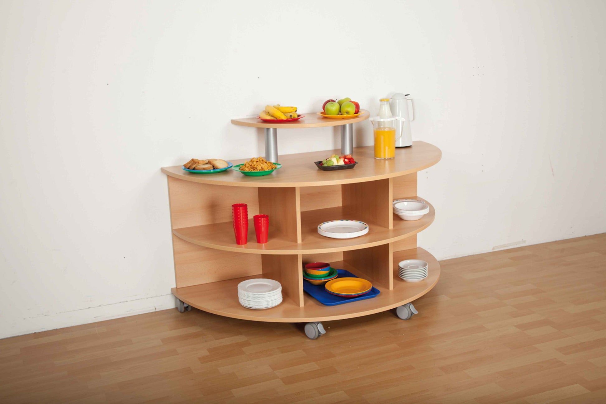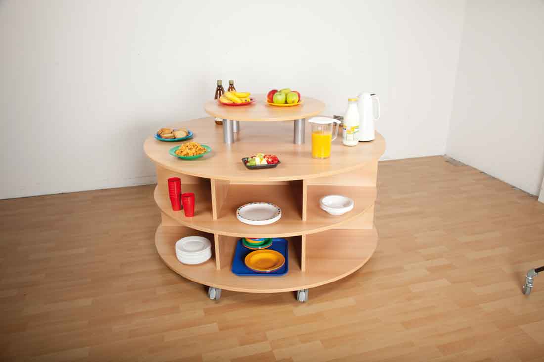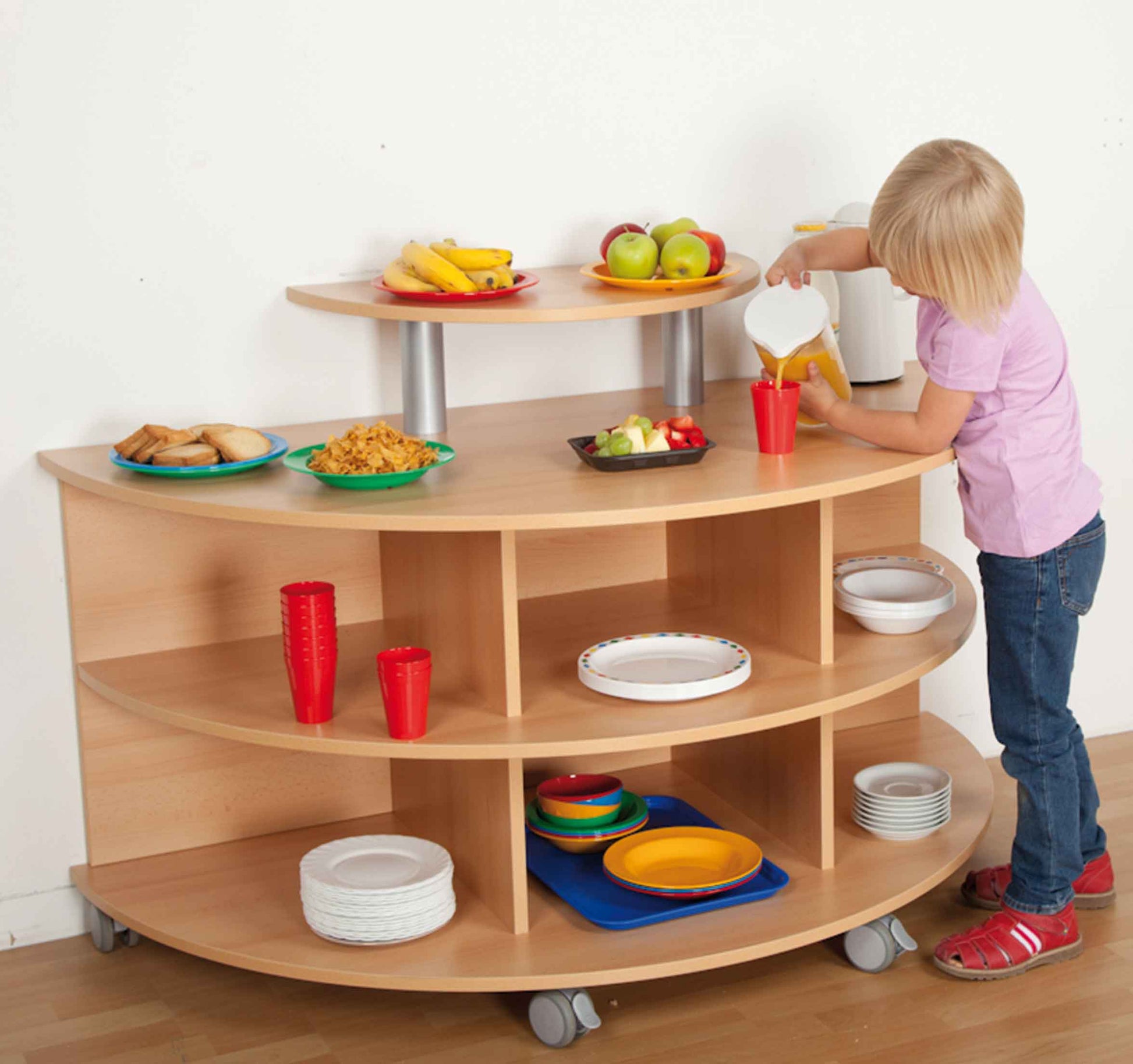 Die Frühstücksinsel hat 6 geräumige Fächer sowie einen Halbkreisaufsatz für Teller oder Speisen. So können sich die Kinder ihr Essen oder Trinken selbst holen.