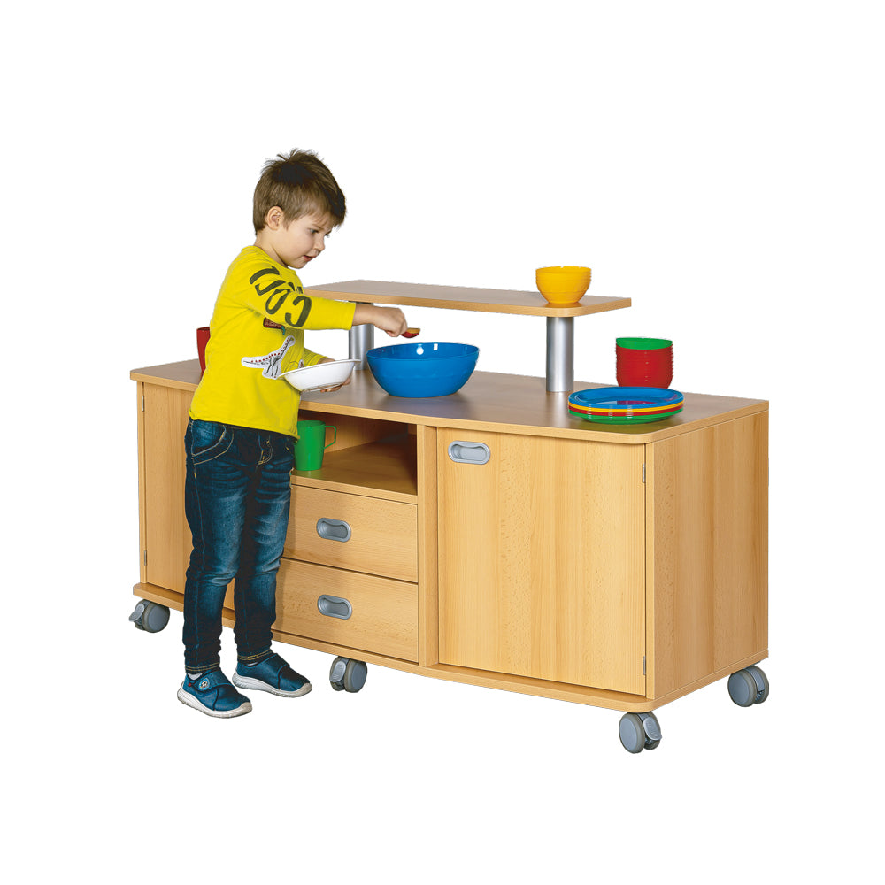 Frühstückstheke mit 2 Türen und innenliegendem Einlegeboden, mittig 2 Schübe und darüber ein offenes Fach. Mobile Theke mit 6 Rollen, 2 davon feststellbar.