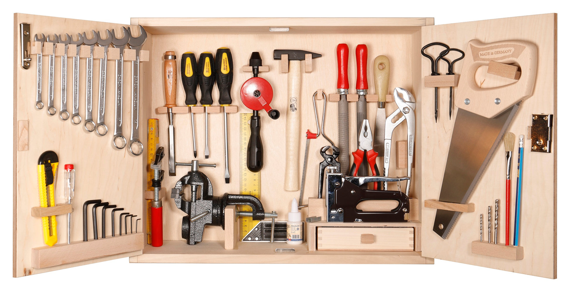 Umfangreich ausgestatteter Werkzeugschrank aus Holz. Grundausstattung für Kindergarten und Schule. Alles funktionierende Werkzeuge.