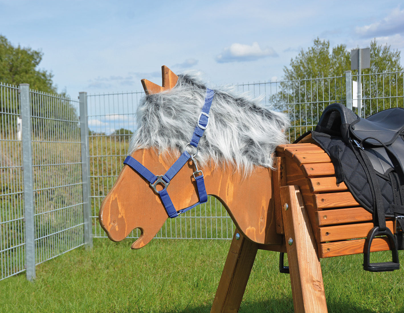 Hochwertiges, wetterbeständiges Halfter aus stabilem Gurtband mit Chrombeschlägen.