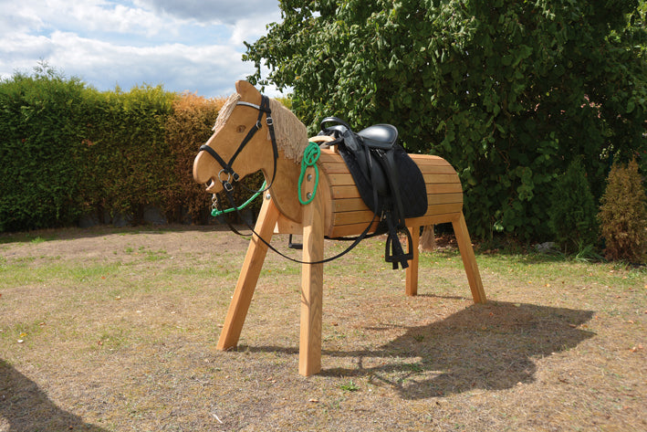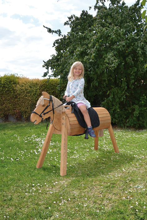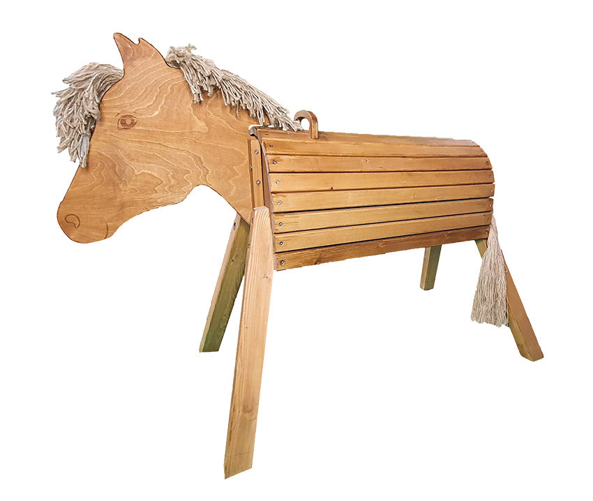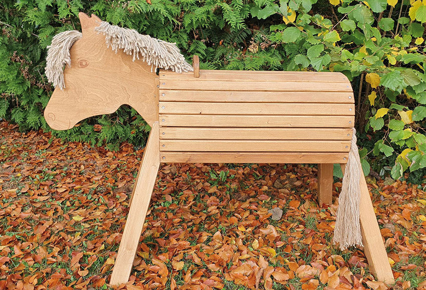 Das Holzpferd Leo ist stabil, sicher und robust. Auf ihrem Rücken haben 2 Reiter Platz.