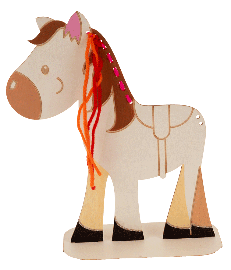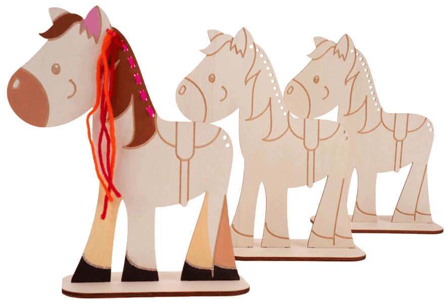 3 niedliche Holzpferdchen zum Bemalen. Die Pferdchen sind einseitig mit Konturen versehen. Die Mähne kann kreativ mit Wolle gestaltet werden, und es gibt Löcher zum Flechten und Einknüpfen von Wollmähnen (Wolle oder Schnüre sind nicht im Lieferumfang enthalten).