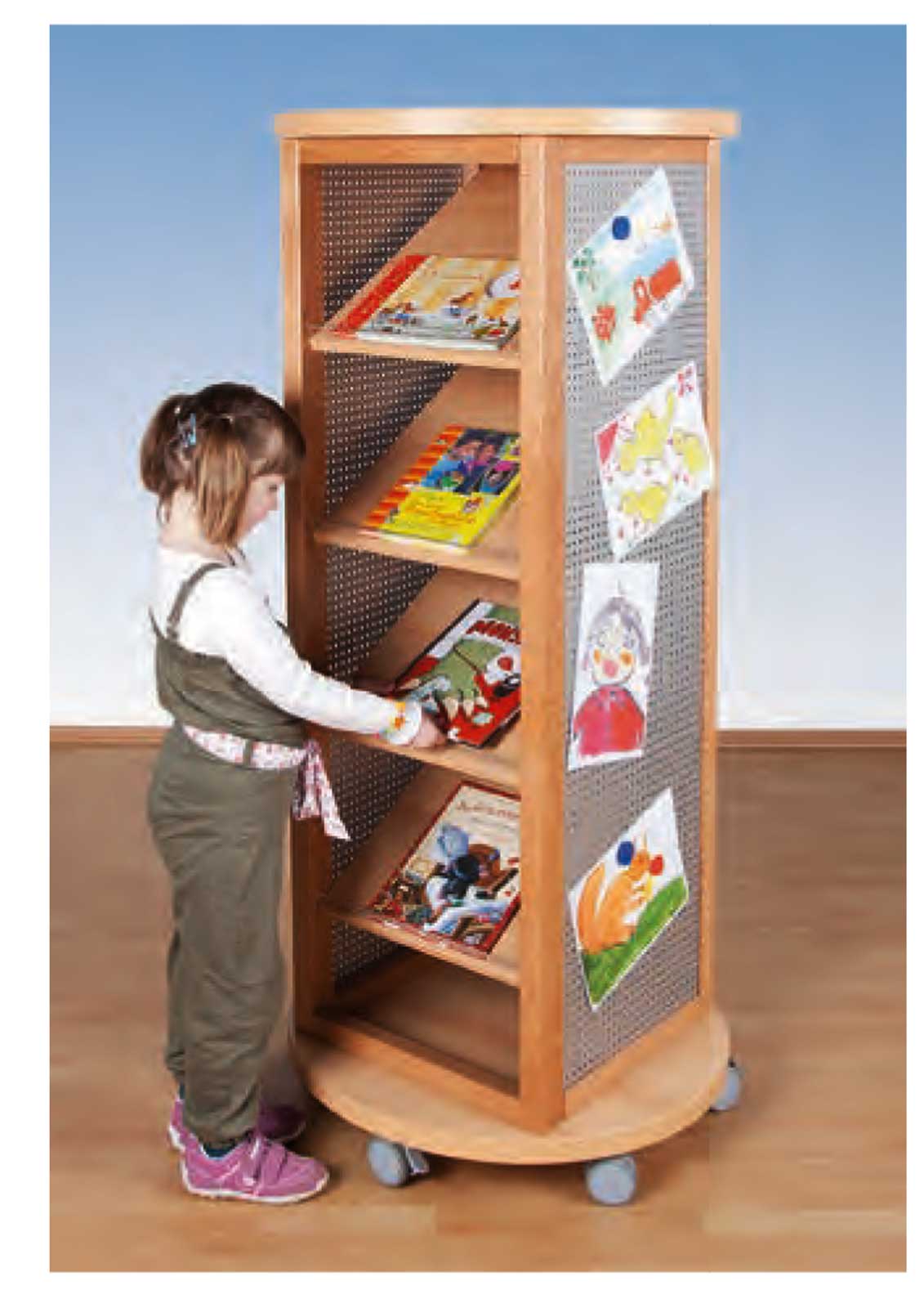 Infosäule mobil mit Regalen und Lochblechwand. Standarddekore: Buche hell, Birke, Weiß oder Grau mit weißalu-farbener oder lichtgrauer Lochblechtafel.