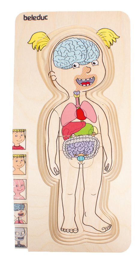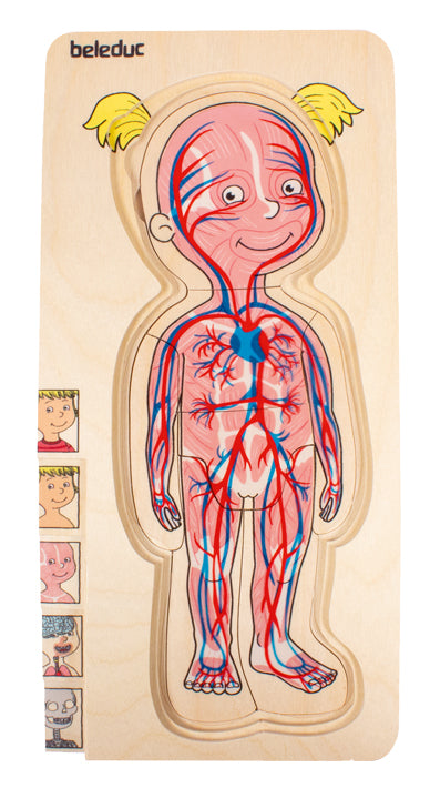Das Puzzle zeigt in anschaulicher und kindgerechter Weise den Aufbau des menschlichen Körpers vom Skelett zu den Organen, über die Muskeln, mit Darstellung des Blutkreislaufes, vom nackten, bis hin zum angezogenen Kind.
