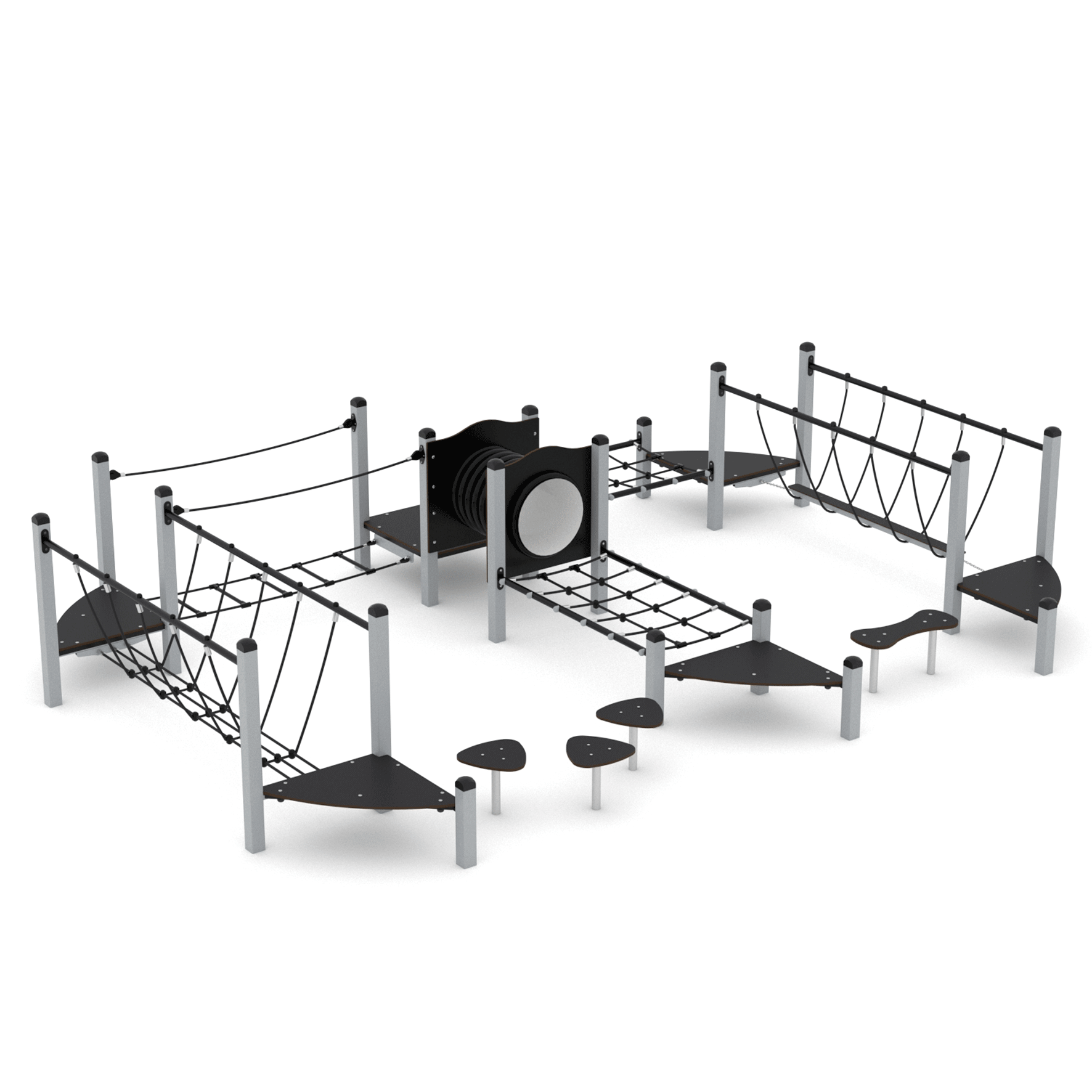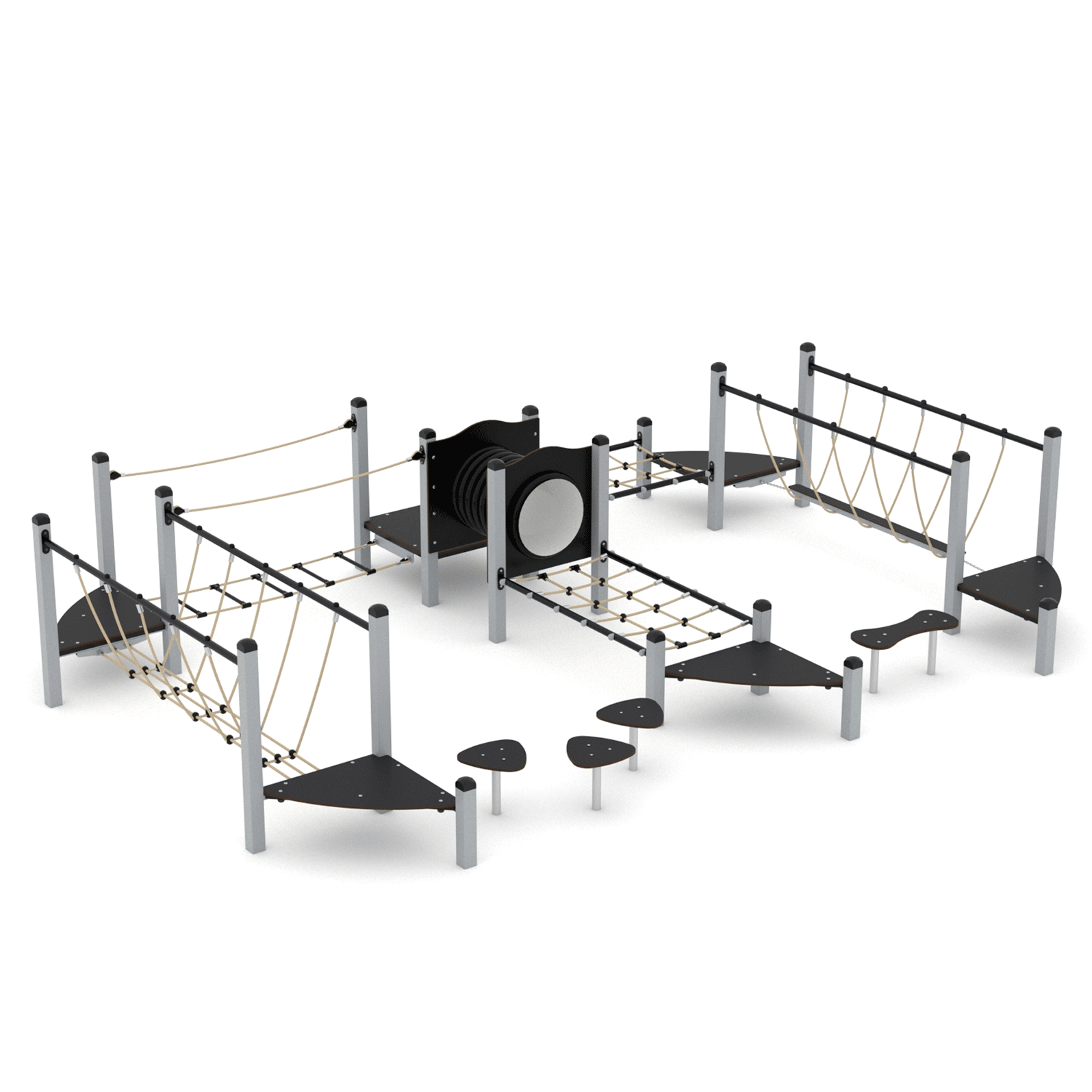 Abwechslungsreiche Elemente: Ein spannendes Design mit verbundenen Kletter- und Balancier-Elementen, Seilbrücken und einem zentralen Durchgang.