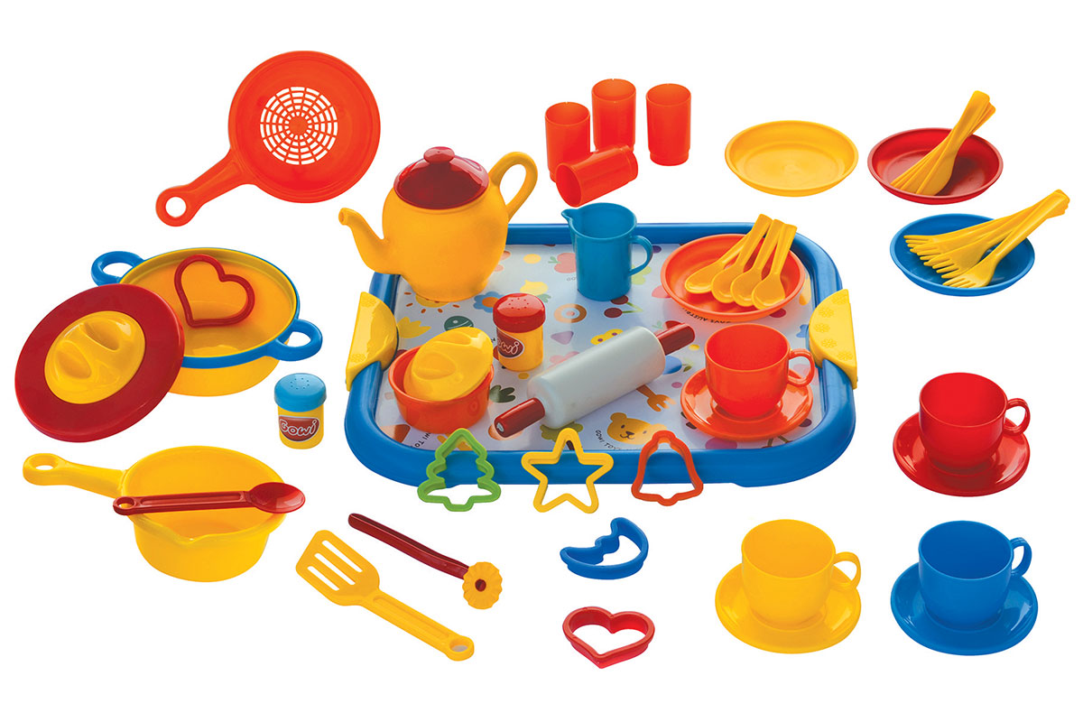 Inhalt: Tablett, Kasserolle, Küchensieb, Kochtopf inkl. Deckel, Kochlöffel, Pfannenwender, Becher, Besteck (Messer, Gabel, Löffel), Kännchen, Kanne mit Deckel, Tassen, Teller, Zuckerdose, Keksausstecher Salz- und Pfefferstreuer, Teigrad und Teigausroller.