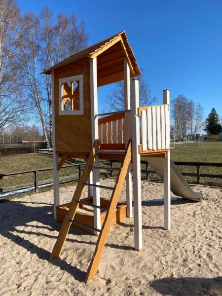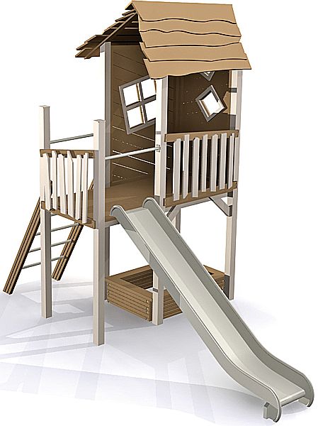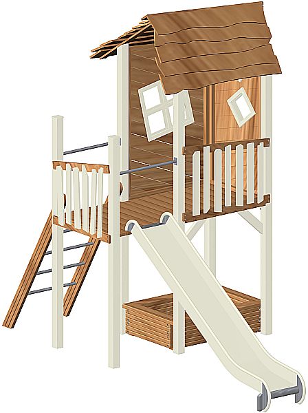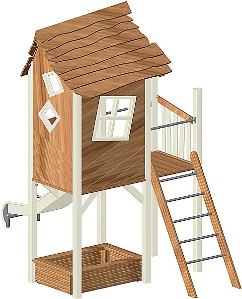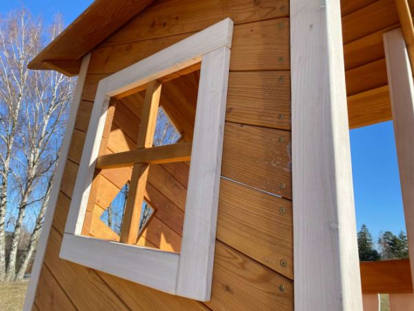 Getestet nach DIN EN 1176 - Außenspielgerätenorm, deshalb hat das Spielhaus auch keine Fenster und Türen zum Öffnen und Schließen. Dieses ist aufgrund der Norm nicht zugelassen.
