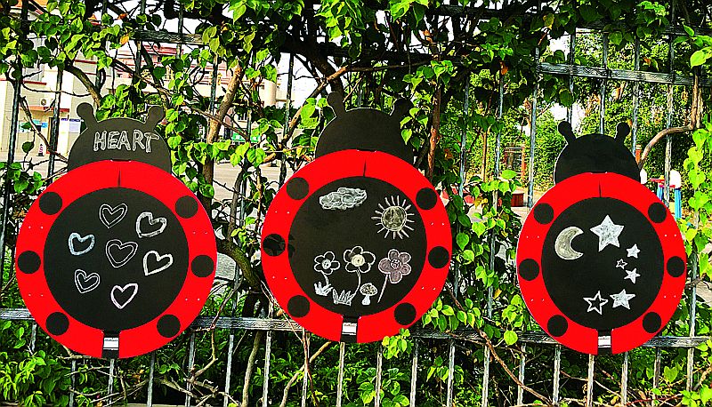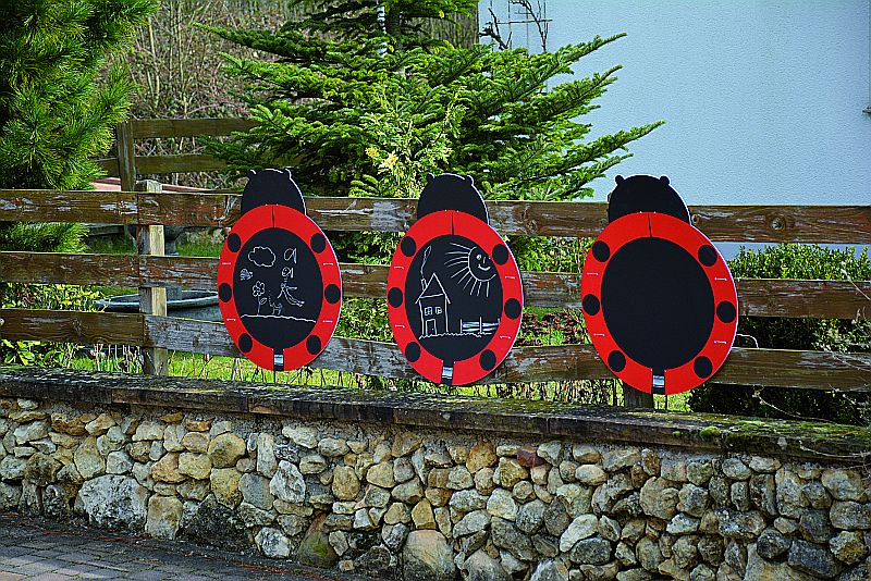 UV-Beständige Tafel im Marienkäfer-Design. Alle "schwarzen" Flächen sind für Tafelkreide geeignete