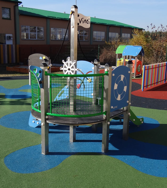 Der Turm ist in der Grundform Halbrund. Die 6 Pfosten aus rostfreien Stahl und der große Spielmast mittig aus gleichem Material gibt schon einmal das Gefühl der hohen See. Am Spielmast ist ein bewegliches Steuerrad angebracht. Das Bug wird mit einer verspielten angedeuteten Galion betont. Auf dem die Brücke, die 59 cm vom Erdboden ist, kommt man über eine Treppe mit angedeuteten Handlauf für einen sicheren Aufstieg. Podest und Stufen sind eine rutschfeste und wasserfeste Multiplexplatte oder HDL-Platte. Die bunten Seitenwände sind aus witterungsbeständigem HDPE oder HPL-Platten. Dazugehörige Flagge und Ruder sind aus witterungsbeständigen HDPE-Blech. Die Stahlseile aus Polypropylengeflecht sind mit langlebigen Kunststoffelemnten, Edelstahl oder Aluminium verbunden.